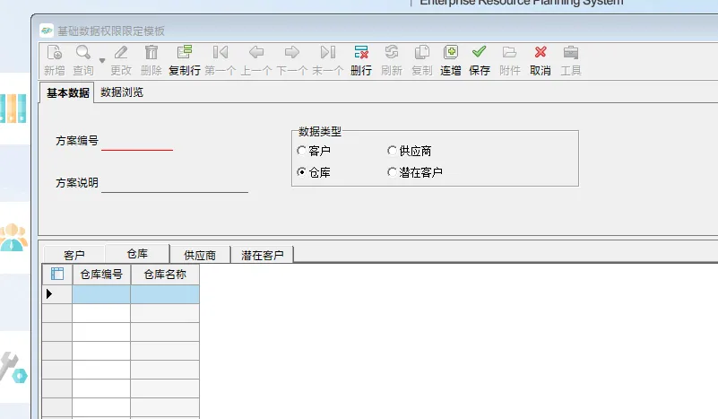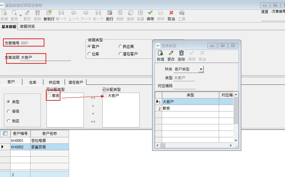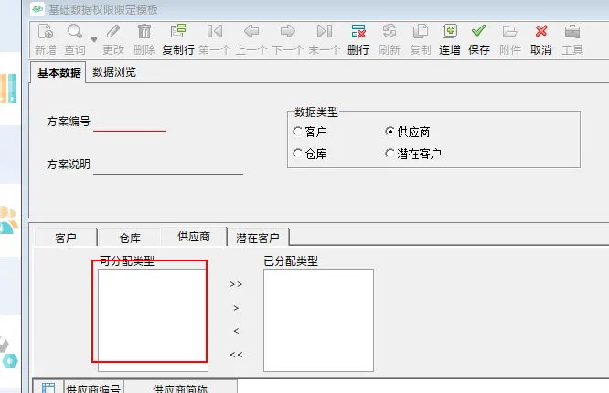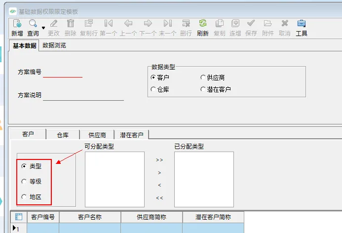 1 打开《基础数据限定模板》,点新增方案如下图,输入自编的方案编号和名称,将可分配类型用移到已分类型中,保存就表示这个方案只限定这个客户类型的所有客户
