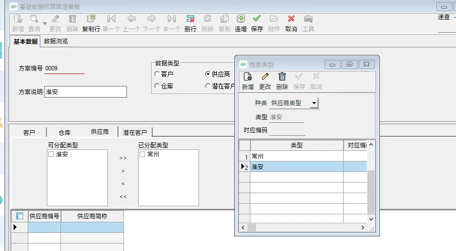 对于供应商也同上操作就行了。此处说明的可分配类型中下面的供应商或客户类型是多个的,可以一个或多个移到已分配类型中。说明限定基础数据可以限定用户对一个类型或多个类型客户或供应商相关信息的查看权的