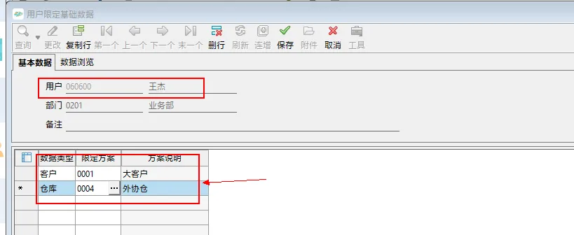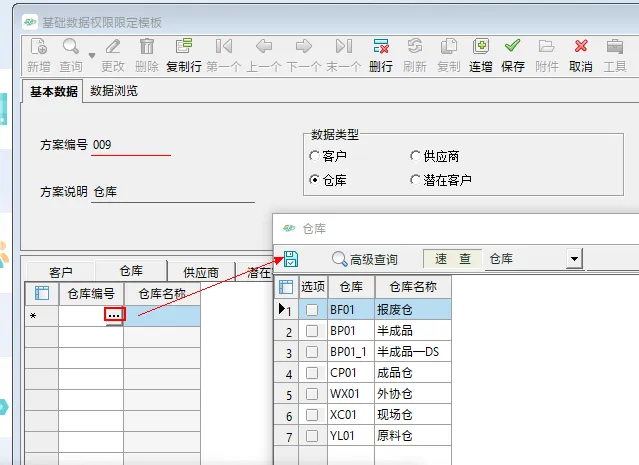 2 打开《用户限定基础数据》,针对不同用户来选择上面不同的方案(客户,供应商,仓库),可以一次全选到位