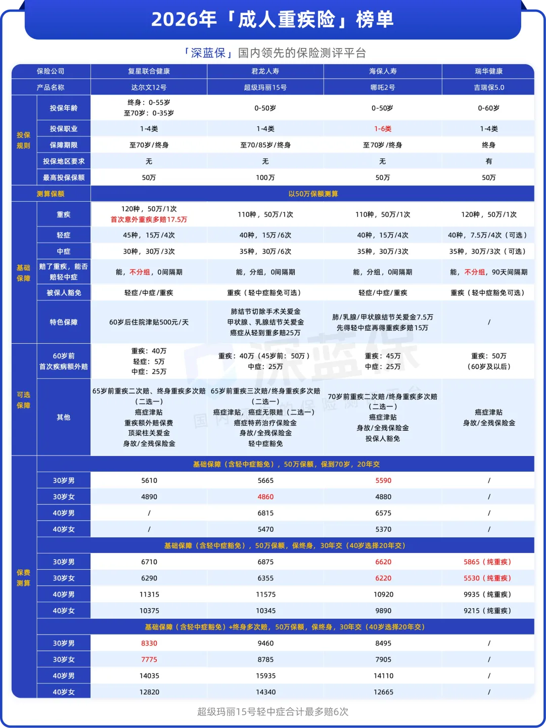 那为了你们能少走弯路,一次性就买对、不花一分冤枉钱,我们深蓝保金榜团队特地测评了市面上近百款重疾险