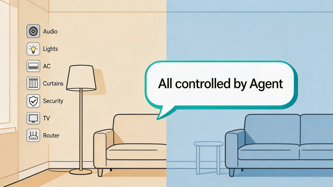 音响、灯光、空调、窗帘、安防,全部统一到一个WhatsApp对话里。你想看电影,说一句”我要看电影”,Agent自动把灯光调暗、窗帘拉上、音响调到影院模式、空调调到合适温度。