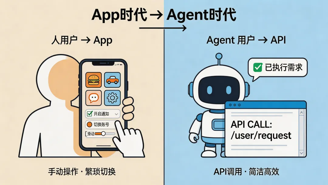 App本身正在变成一个薄层,真正的价值在API和后端服务。你不需要再考虑界面好不好看,而需要考虑你的服务能不能被Agent顺利调用。