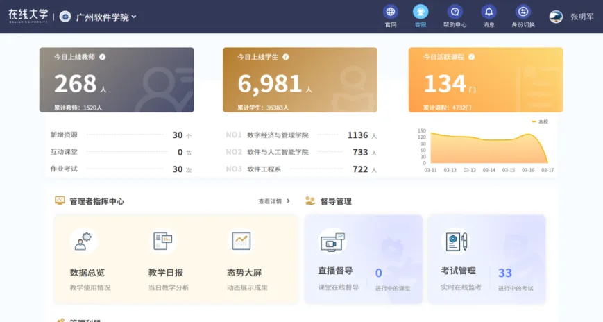 同时,平台为广州软件学院的管理者们搭建了管理者指挥中心与督导管理体系,集成数据总览、教学日报、态势大屏、直播督导、考试管理等核心功能。管理者可一键查看当日教学分析、动态展示教学成果;督导可在线完成课堂巡课、实时督导;考试管理模块支持实时在线监考,全方位保障教学秩序与教学质量。