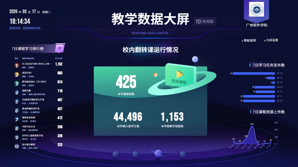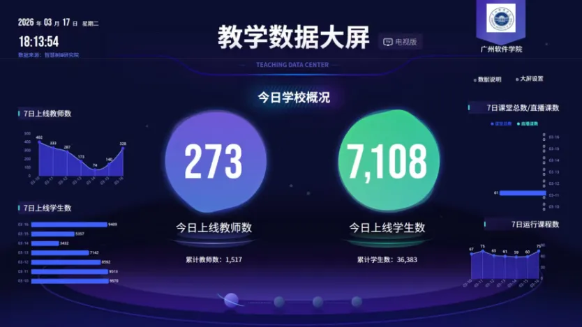 同时,平台基于广州软件学院的学生们全流程学习数据,自动生成多维度学情分析报告,帮助教师精准识别班级整体学习趋势与学生个体薄弱环节,实现因材施教;7日课程学习排行榜、课堂互动排行榜等数据,也可直观呈现学校学生的学习积极性,为教学优化提供数据支撑。