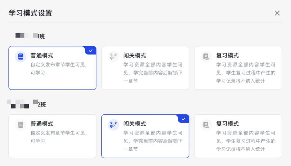 针对多班级、跨院系教学场景,教师可一键同步备课内容至多个班级,也可根据不同班级特点,灵活设置闯关、复习、普通三种学习模式,适配不同课程的教学需求,大幅降低重复备课工作量。