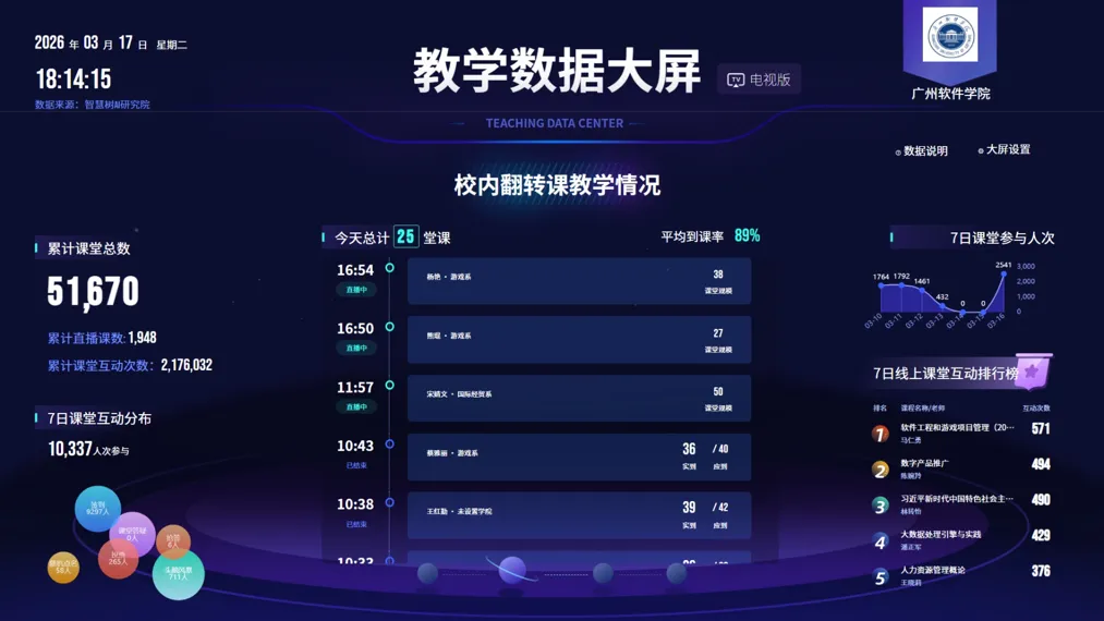 平台全面支持线下授课与线上直播双轨模式,完美适配广州软件学院校内的日常教学、直播授课、跨校共享课等多元场景。目前广州软件学院累计课堂总数达51670节,累计直播课1948节,累计课堂互动超217万次,单日最高开设25堂直播课,课堂平均到课率达89%。