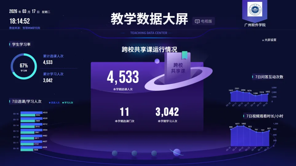本学期,广州软件学院跨校共享课已上线11门,累计选课人次4533人,累计学习人次3042人,学生整体学习率达67%。平台可实时呈现7日选课学习人次、问答互动次数、视频观看时长等核心数据,帮助教师与管理者精准掌握课程学习情况,及时调整教学安排,保障共享课程教学质量。