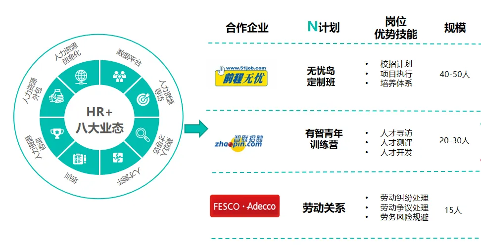 1+N——校企联培、就业直通:专业创新性采用1+N培养方式,1即专业核心能力培养,‘N’为与多家行业头部企业,如前程无忧、智联招聘、外企德科、上海外服等开展的专业特色能力训练营/定制班,培训结束颁发企业认定证书,成绩优异者直通实习、就业。