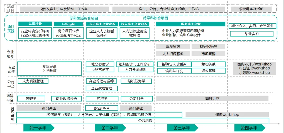 第三年(专业核心+微方向包):培训与开发、社会保障概论、薪酬管理、绩效管理、劳动关系与劳动法、数字化人力资源管理实训、组织管理方向、业务管理方向、数字化运营、市场营销、商业管理等方向课程包选修