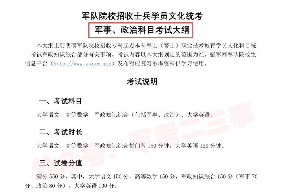部队战士的考试内容,统一都是在强军网军队院校招生信息平台有发布。只是适用于招收专科起点本科军士(警士)职业技术教育学员的考试大纲也只是对军事、政治学科进行了详解,其他三个学科则是默认了考生在报考前已经完成了相应的学习了而只做了简述。