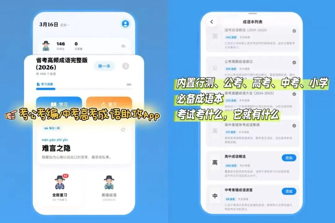 它把刚需成语库全梳理好了,中高考必学成语、行测常考成语、省考国考真题成语,就连最容易踩坑的“易错误用”成语,都单独整理成册。考什么就学什么,再也不用到处搜罗资料,打开App,要学的内容全都一目了然。