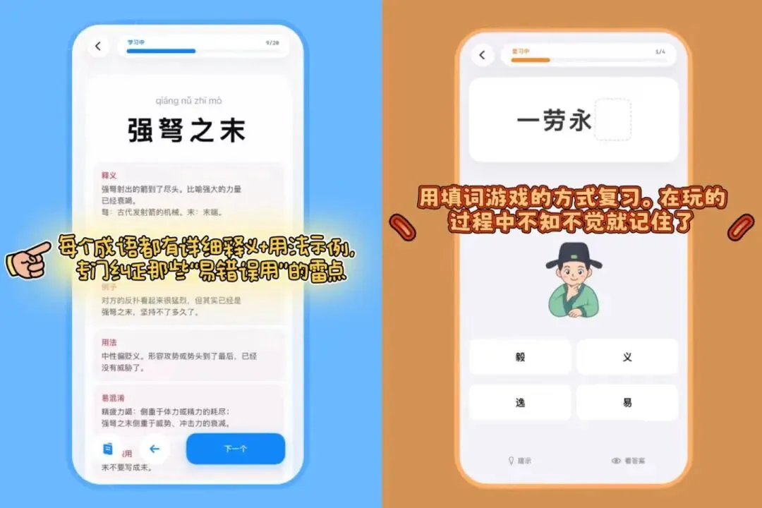 学完就忘,是我之前最大的痛点。「天天成语」用填词游戏的方式帮我复习。给你一个成语,空出易错字的位置,从几个选项中选出正确的。像玩小游戏一样,不知不觉就记住了。比死记硬背、反复抄写效率高太多,坚持下来也完全不费劲。