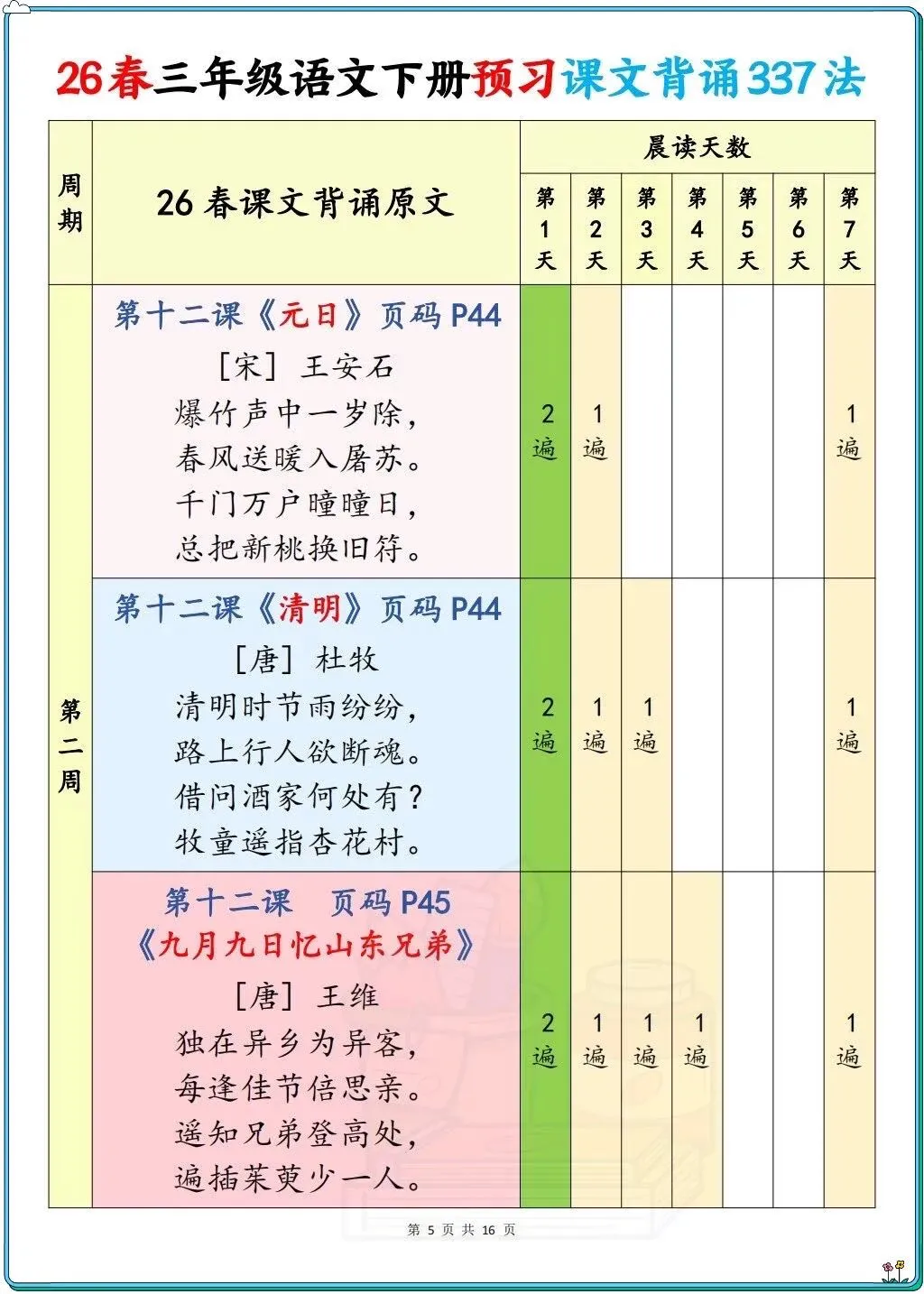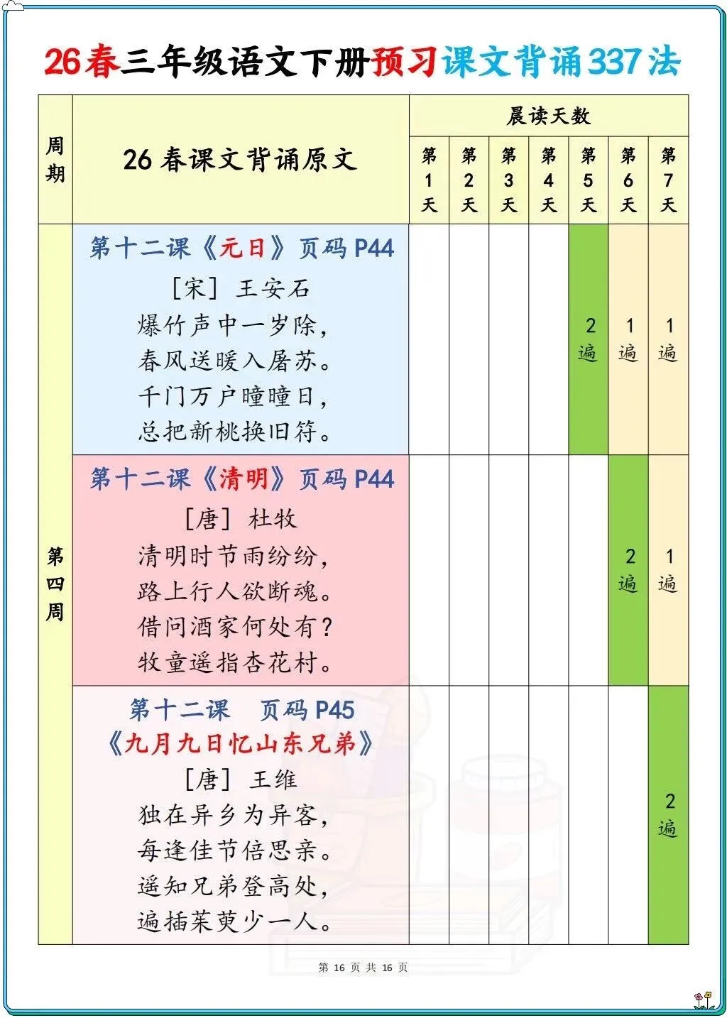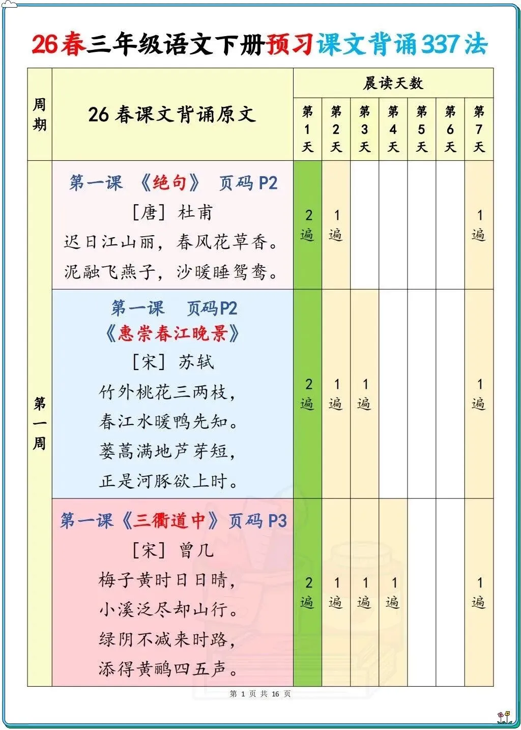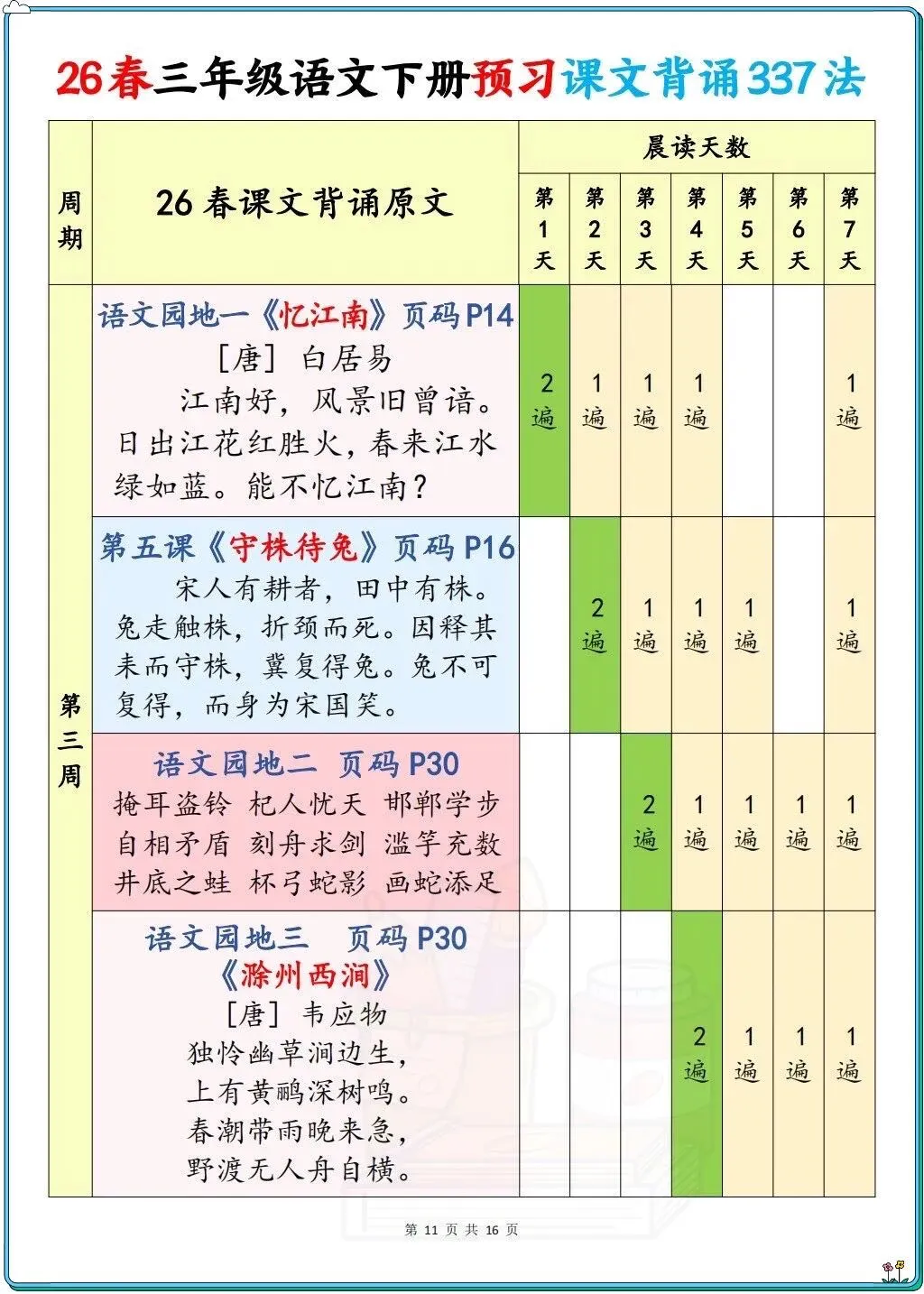 孩子背书慢、记不牢、背完就忘?晨读浪费时间,死记硬背效率低,家长跟着也心累~这份实用的337背诵法+必背内容,整理三年级下册全书必背考点:古诗、重点课文段落、日积月累成语、国学名句等,按课本顺序整理好,直接打印就能用,轻松搞定全册背诵!