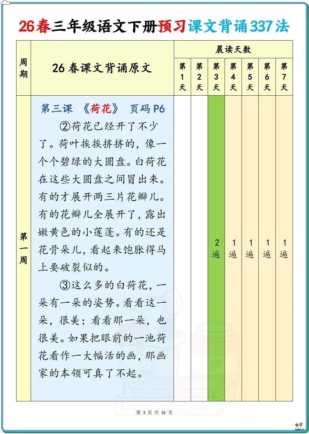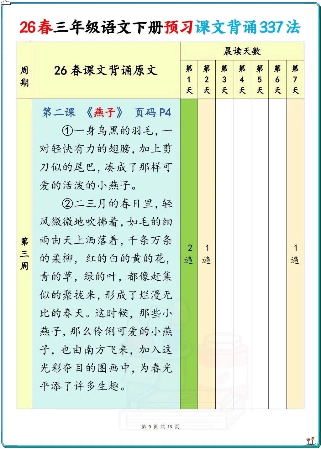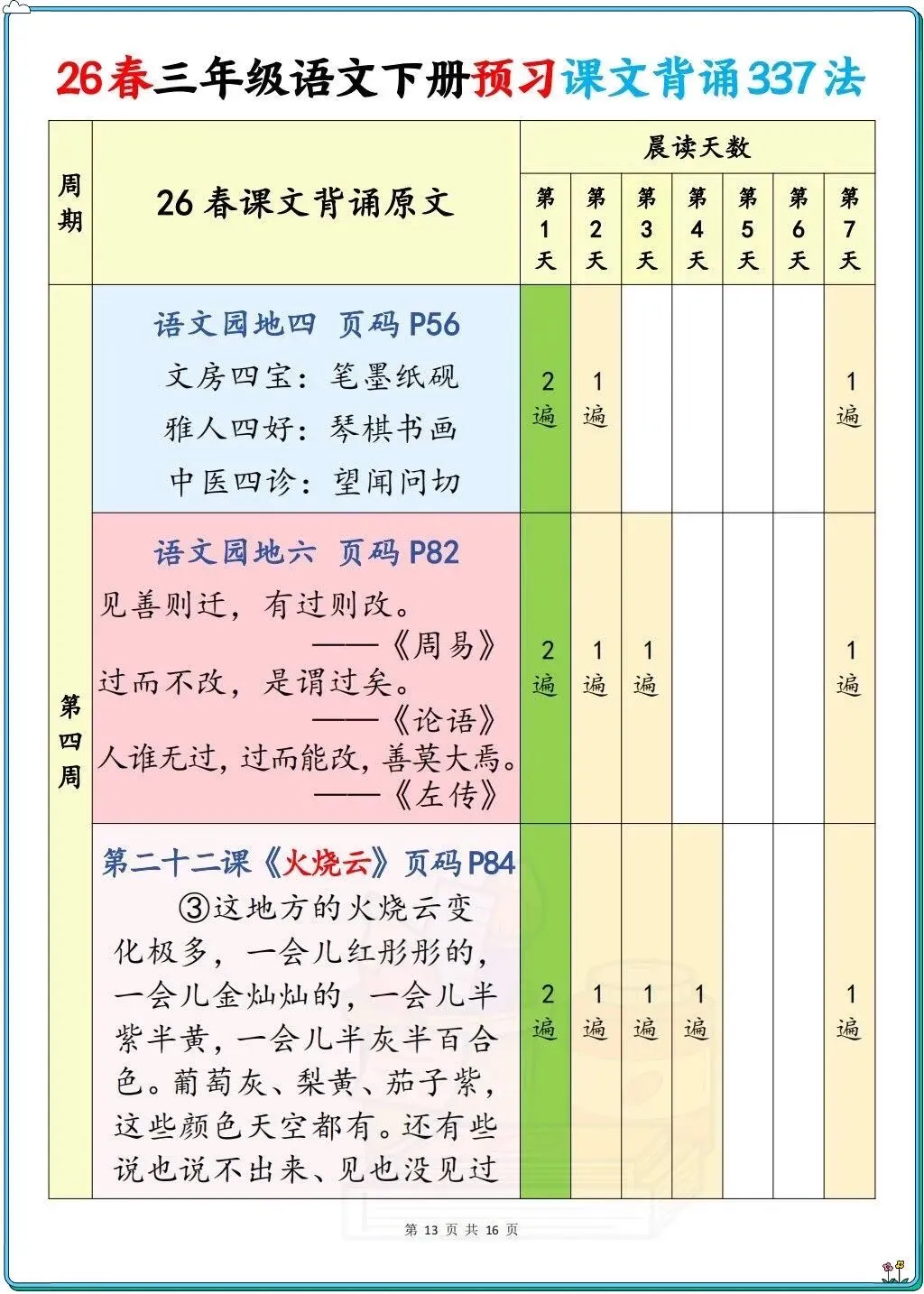 孩子背书慢、记不牢、背完就忘?晨读浪费时间,死记硬背效率低,家长跟着也心累~这份实用的337背诵法+必背内容,整理三年级下册全书必背考点:古诗、重点课文段落、日积月累成语、国学名句等,按课本顺序整理好,直接打印就能用,轻松搞定全册背诵!