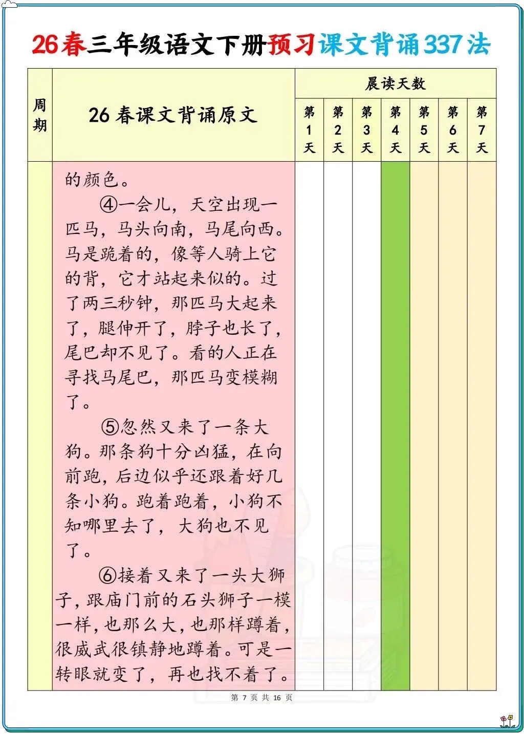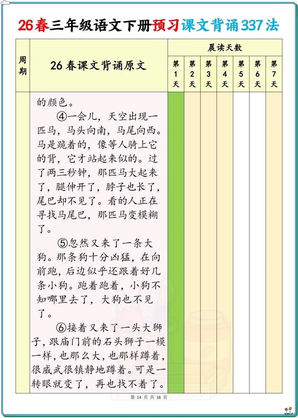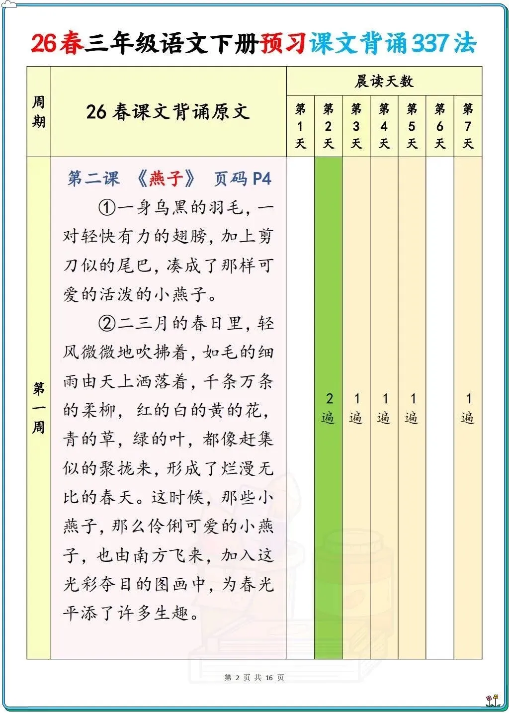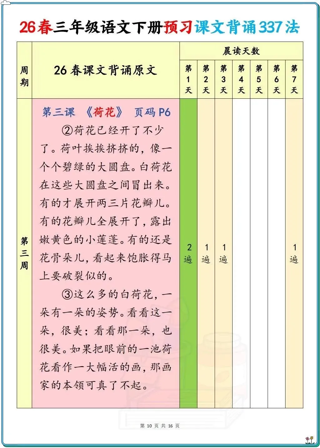 孩子背书慢、记不牢、背完就忘?晨读浪费时间,死记硬背效率低,家长跟着也心累~这份实用的337背诵法+必背内容,整理三年级下册全书必背考点:古诗、重点课文段落、日积月累成语、国学名句等,按课本顺序整理好,直接打印就能用,轻松搞定全册背诵!