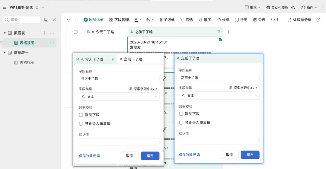 字段设置:– 字段名称:今天干了啥-字段类型:文本-不限制字数-不禁止录入重复值-无默认值– 字段名称:之前干了啥-字段类型:文本-不限制字数-不禁止录入重复值-无默认值