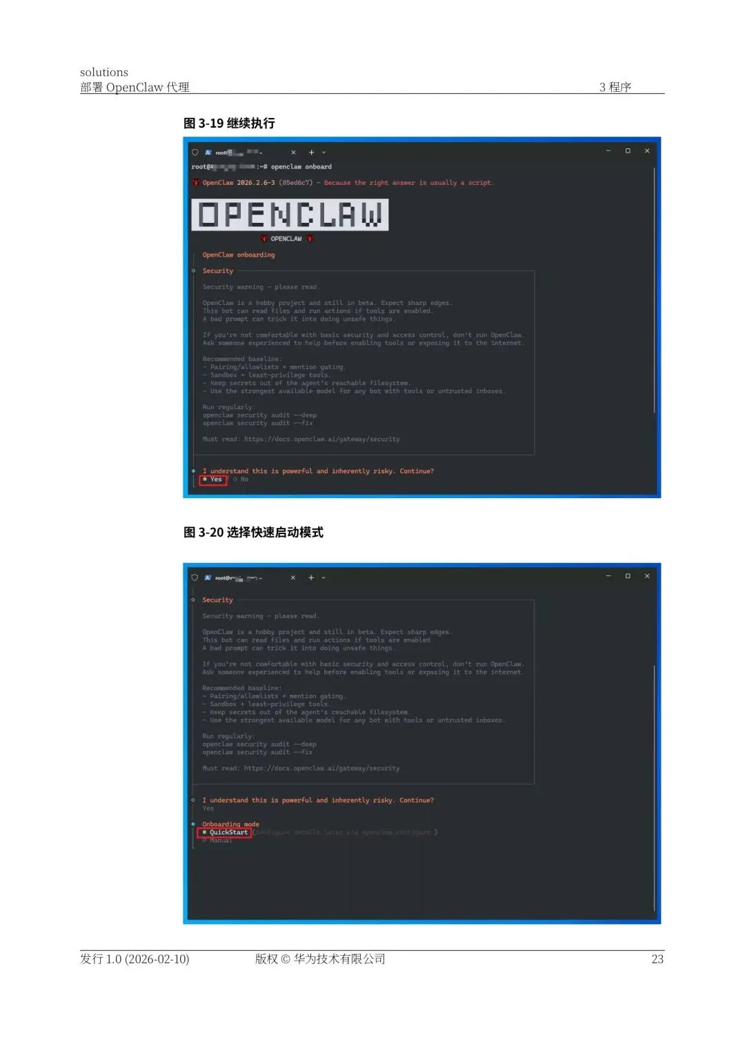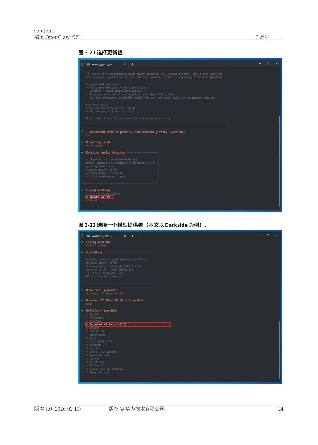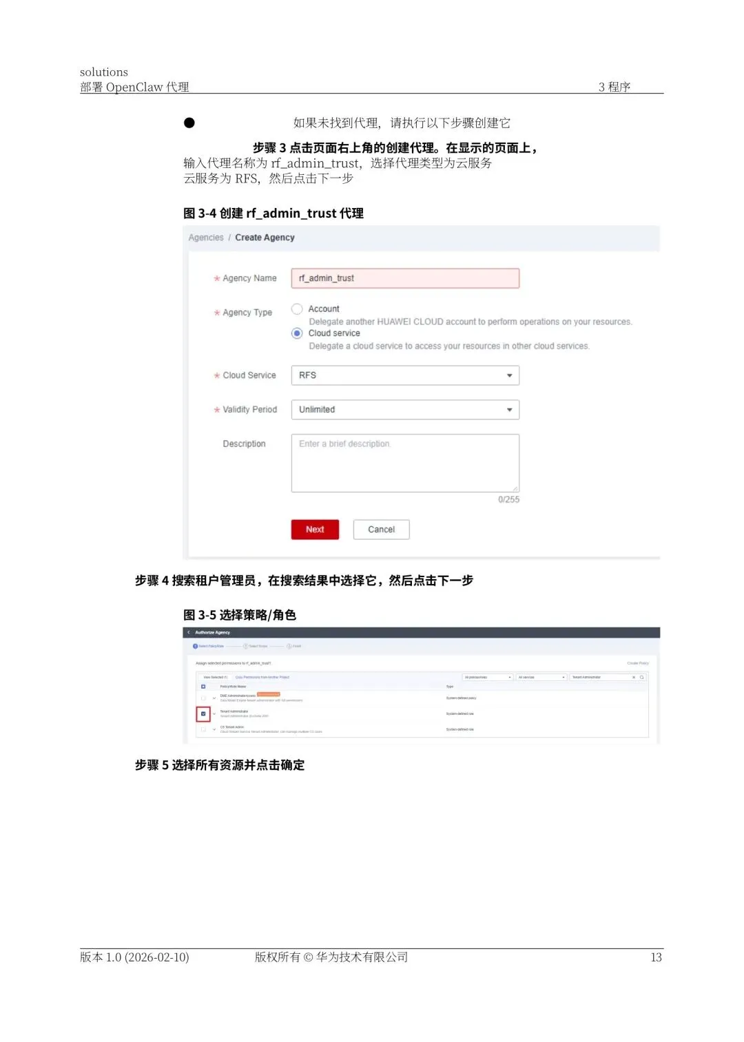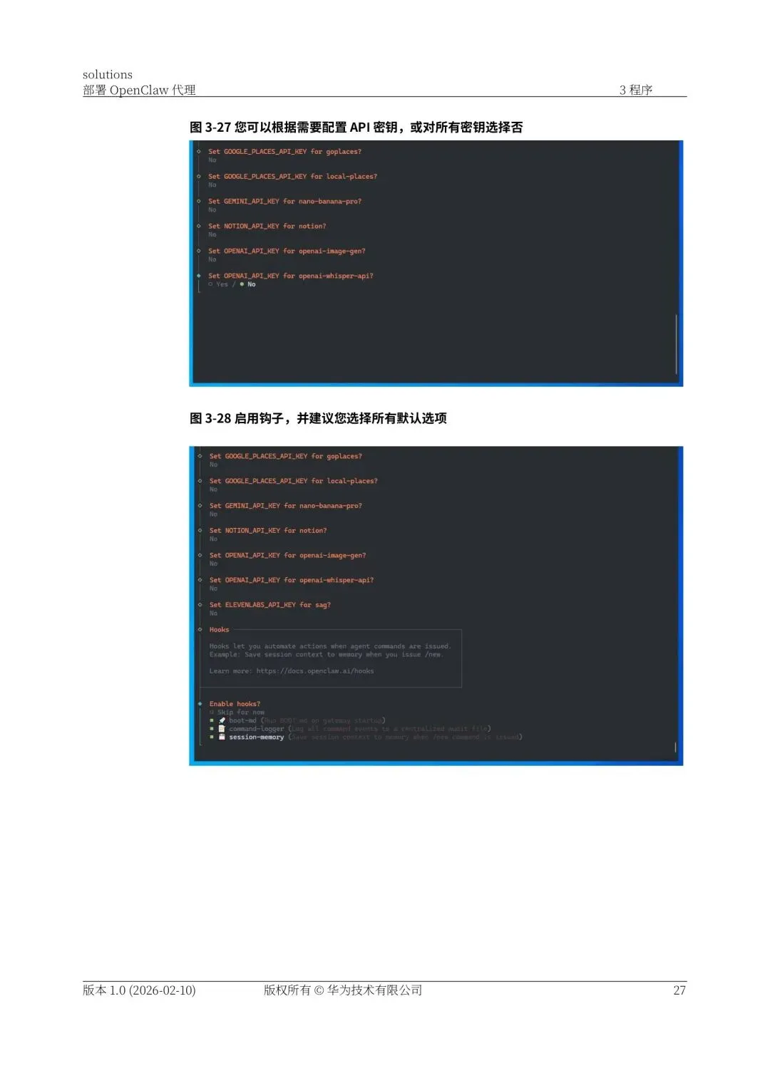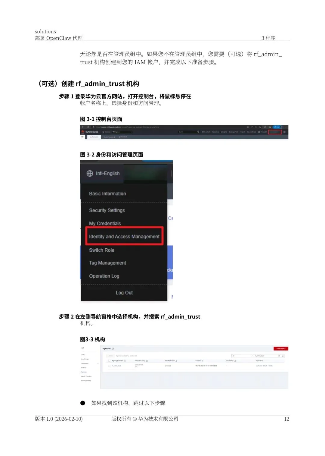 整个部署流程设计得很产品化。准备工作阶段强调权限管理,快速部署通过RFS控制台实现可视化配置,开始使用阶段详细到每个命令行操作。特别值得注意的是初始化配置——从选择模型提供商到配置Discord频道,每一步都有截图指导。这种“手把手”式的文档,反映出华为对开发者体验的重视。