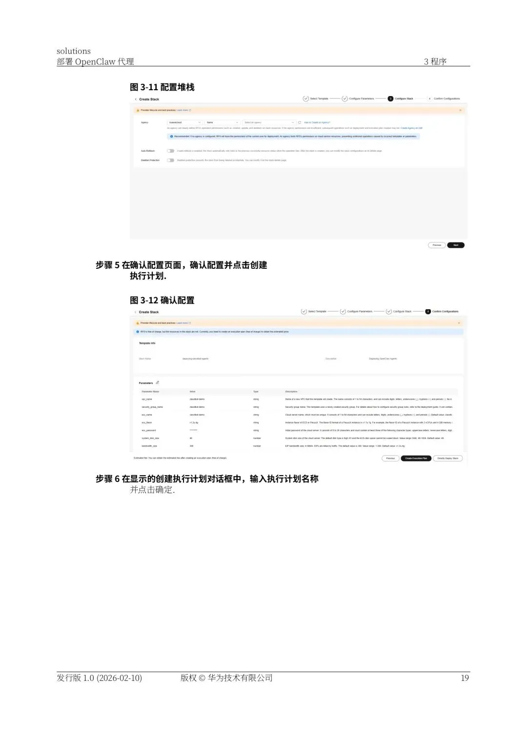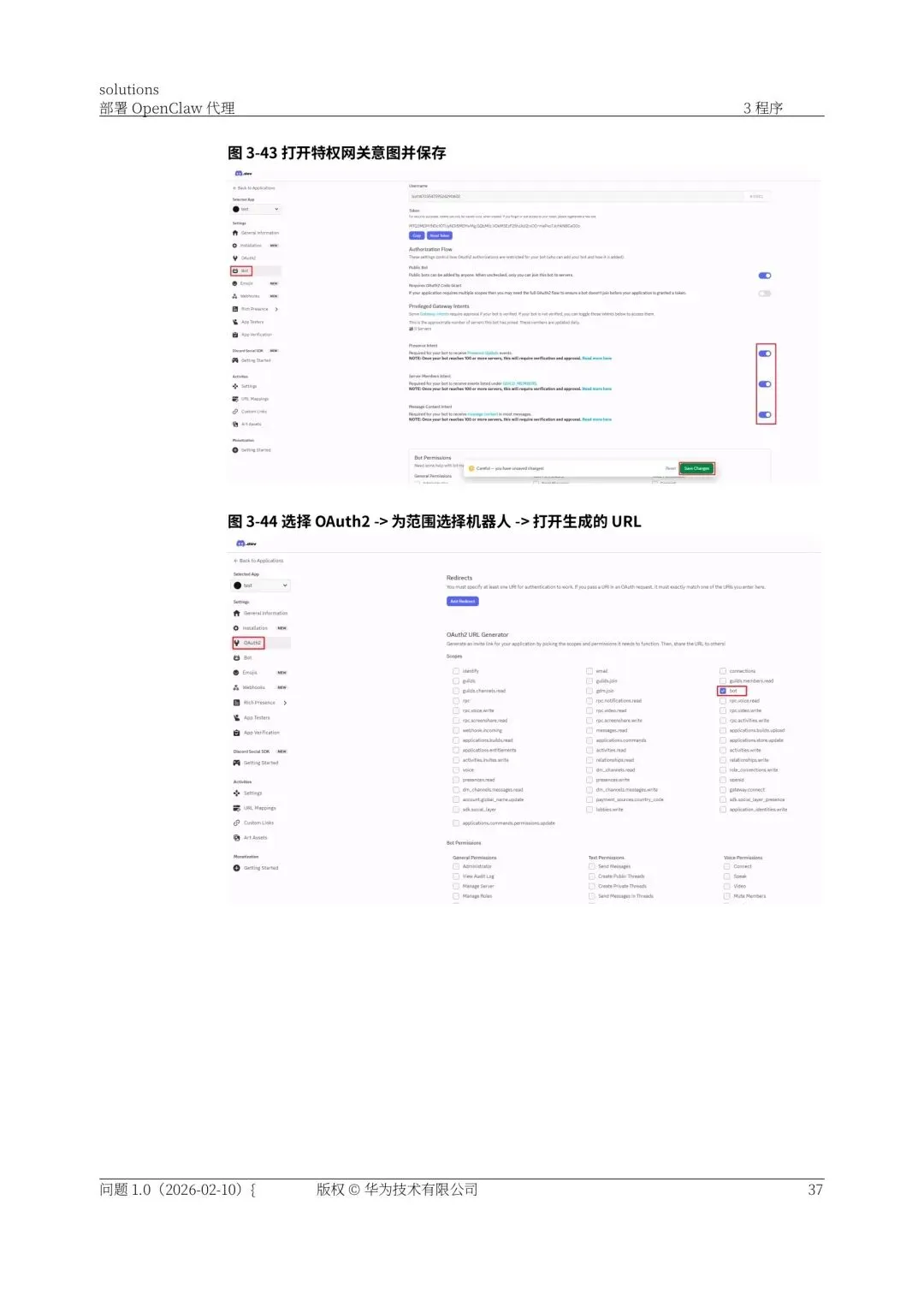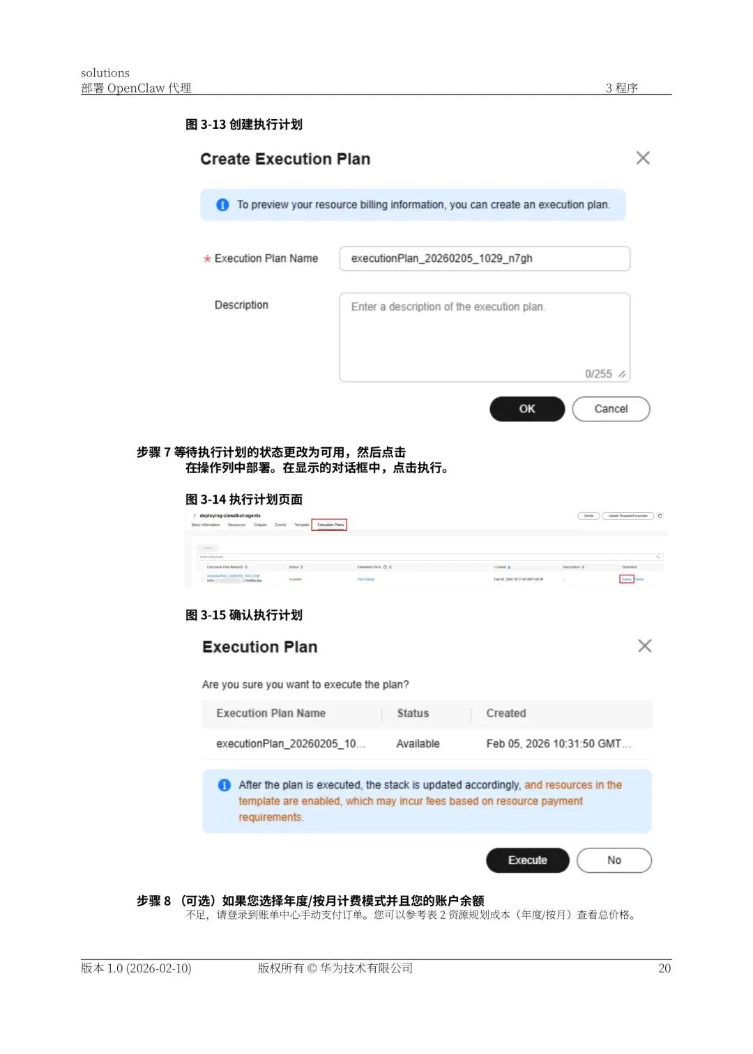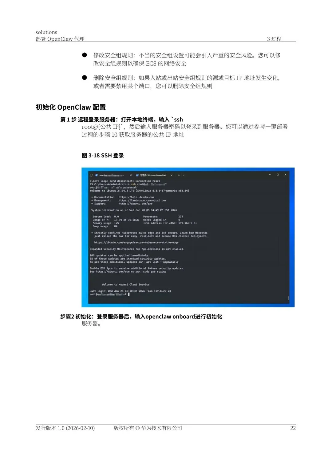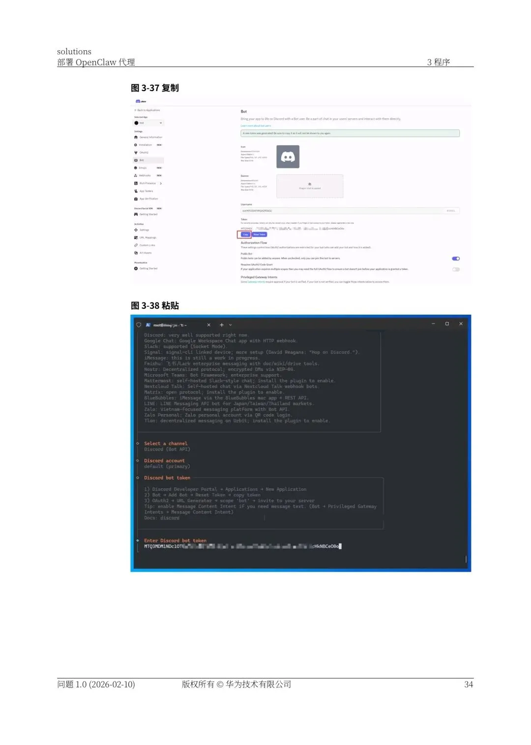 整个部署流程设计得很产品化。准备工作阶段强调权限管理,快速部署通过RFS控制台实现可视化配置,开始使用阶段详细到每个命令行操作。特别值得注意的是初始化配置——从选择模型提供商到配置Discord频道,每一步都有截图指导。这种“手把手”式的文档,反映出华为对开发者体验的重视。