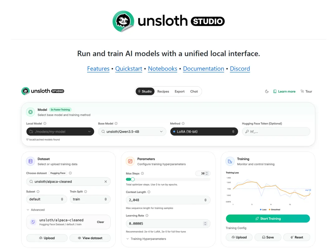 Unsloth 是一个开源的统一 Web 界面,旨在让用户能够在本地轻松训练和运行开源大语言模型,如 Qwen、DeepSeek、Gemma 和 GPT-Oss 等。无需昂贵的云计算资源,无需复杂的技术配置,用户只需通过浏览器即可在个人电脑上完成大模型的微调和部署。这个项目凭借其极低的学习门槛和强大的功能支持,在开源社区迅速走红,目前已在 GitHub 上斩获 56,000+ Star,成为本地大模型领域最受关注的明星项目。