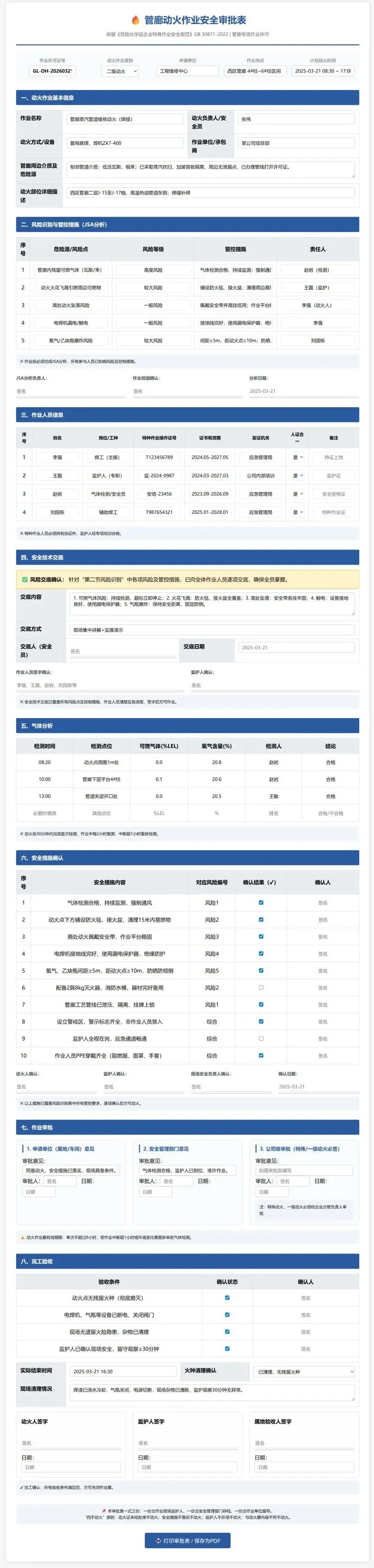 🔥 管廊动火作业安全审批表