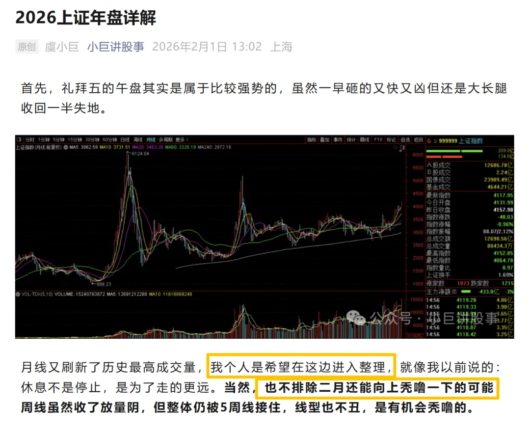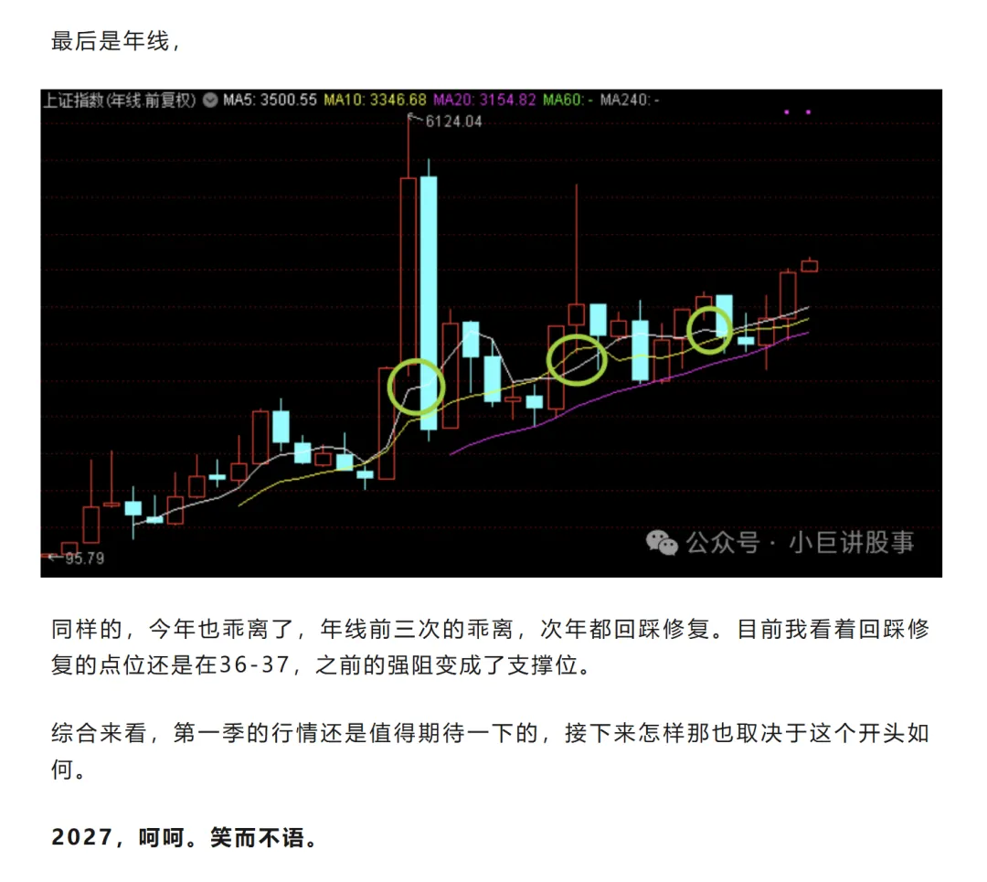 今年年线已经乖离了,如果今年向上硬打,那明年就是五六千点之后那两种结果。如果真的想做慢牛,那今年就该全部苟住,把年线做成十字星的整理形态,然后2027再上扬。所以我个人也倾向于又要进入季线级别的整理期。进入季线整理,那这段小牛就算告一段落了,近三季成交量辣么大,也该整整了。