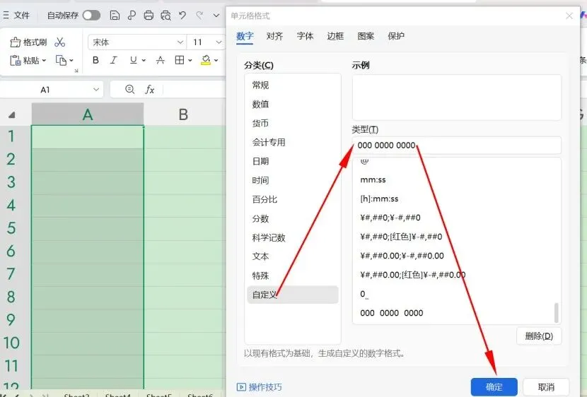 首先,选中需要设置的区域如A列,直接按快捷键Ctrl+1,或者单击右键,选择【设置单元格格式】→自定义→【类型】那里输入想要分段的格式,如000 0000 0000→【确定】。