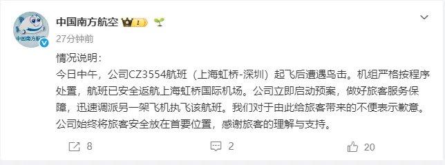 今日中午,公司CZ3554航班(上海虹桥-深圳)起飞后遭遇鸟击。机组严格按程序处置,航班已安全返航上海虹桥国际机场。公司立即启动预案,做好旅客服务保障,迅速调派另一架飞机执飞该航班。我们对于由此给旅客带来的不便表示歉意。公司始终将旅客安全放在首要位置,感谢旅客的理解与支持。