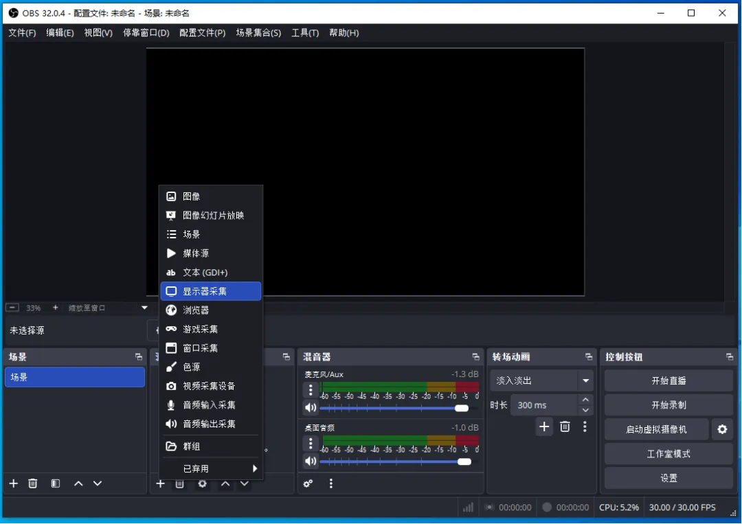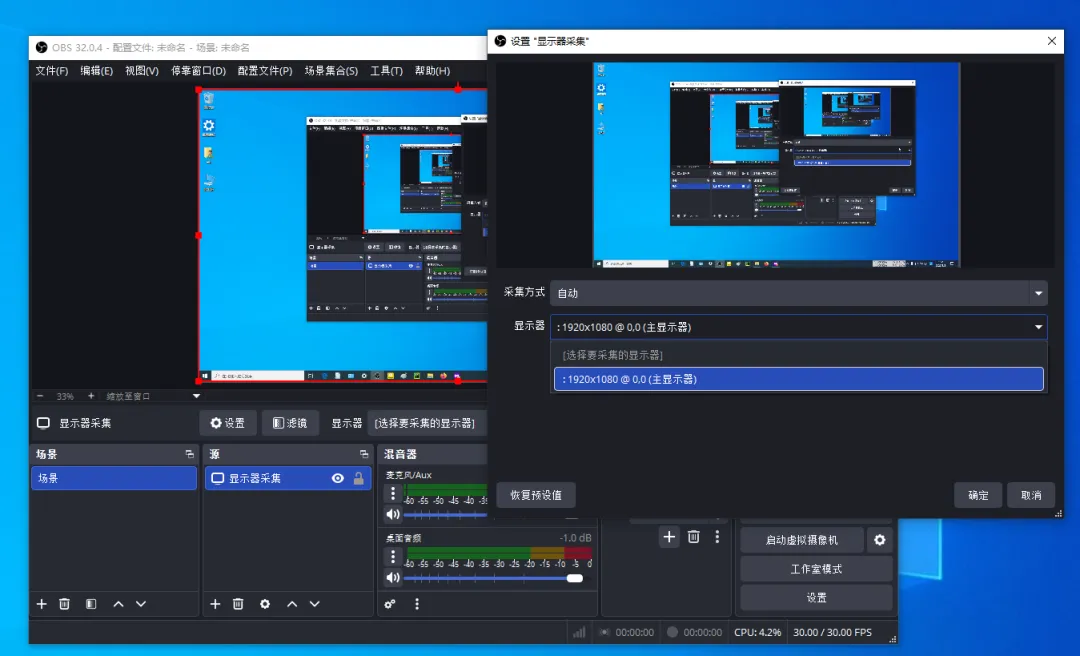 此后,满世界找录屏软件,无意间发现了OBS Studio这开源且免费的工具,用了几天,感觉不错,很丝滑顺畅,就是要动手设置下才能使用。安装完软件后打开,在下半部分第二个位置点那个“+”号,选择显示器采集: