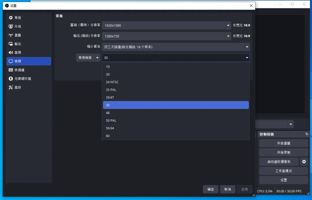 接着点右下角那个设置:点击视频项选择帧率,选小点录屏后的文件体积就相对小点,不会占用太多磁盘容量。