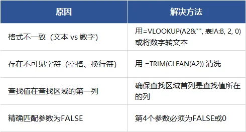 📌 问题4:VLOOKUP返回#N/A,但明明有数据,怎么办?
