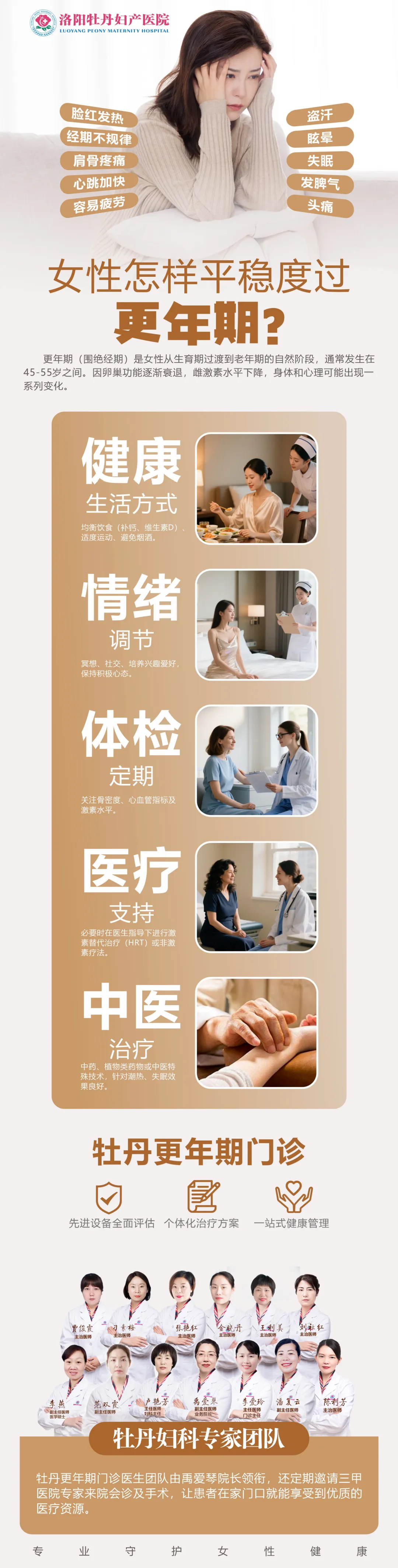 洛阳牡丹妇产医院开设更年期门诊,针对更年期女性及时进行科学的诊疗和综合管理,不仅能改善更年期症状,还能减缓老年疾病的发生。