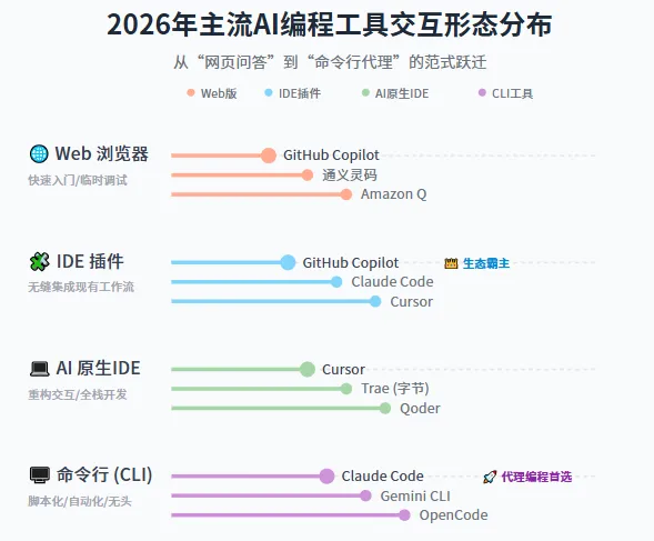 2026年,程序员必备的AI工具全景图 从ChatGPT回答编程问题,到AI原生IDE重构开发流程,再到命令行(CLI)工具无缝嵌入DevOps工具链,AI正在以前所未有的力度重塑软件工程的范式 。面对层出不穷的工具,如何选择?本文将为你梳理2026年AI编程工具的四大形态与主流选择,助你找到最适合自己的“副驾驶”。 🎯 工具形态:从“聊天”到“代理”的演进 如今的AI编程工具已远不止是“智能补全”。根据交互形态,它们大致可分为四类,分别服务于不同的开发场景: 1. Web聊天版 (Web Chat):如ChatGPT的代码解释器,无需安装,开箱即用,适合快速原型、教学或临时调试。 2. IDE插件型 (Plugin-Based):如GitHub Copilot、通义灵码,深度集成于VS Code、JetBrains等主流IDE,主打编程陪伴与效率提升。 3. 命令行工具 (CLI):如Claude Code、Qwen Code,通过终端指令调用,天然契合Shell、Git、Docker等工具链,适合自动化、脚本化和CI/CD集成,深受专业开发者青睐。 4. 独立AI IDE:如Cursor、Trae,以自然语言对话为核心,内置AI Agent,旨在实现从需求到部署的全流程自动化。 🚀 国际主流工具深度解析 🤖 Claude Code:代理式编程的标杆 Claude Code由Anthropic推出,采用“分而治之”的哲学,将复杂开发过程解耦为六个清晰层次(插件、技能、命令、子代理等),被誉为“代理式编程鼻祖”。其CLI模式能端到端地拆解需求、生成规范、编写代码、执行测试并修复问题,实现接近“自主编程”的体验。尽管价格较高,但其强大的任务分解与执行能力,让许多开发者觉得“贵但值”,是交付复杂项目的利器。 ⚙️ GitHub Copilot:生态整合之王 作为最早进入市场的AI编程助手之一,GitHub Copilot已从代码补全工具演变为覆盖全生命周期的智能编码平台。其核心优势在于与GitHub生态的深度整合,能读取仓库的issues、PRs等元数据,提供更贴合项目背景的建议。同时支持强大的权限管控,如代码引用过滤器,防止生成受版权保护的代码片段。 💻 Cursor:AI原生IDE的开拓者 Cursor是首个以“AI优先”理念重构的IDE,基于VS Code深度定制 。其强项在于深度项目级上下文理解、强大的多文件编辑与重构能力,以及自定义行为规则系统,允许团队将工程规范“编译”进AI的推理过程。它适合有一定编程基础、希望用自然语言驱动复杂项目开发的开发者。 🔧 OpenCode:开源的终端新贵 OpenCode是一款基于Go开发的开源AI命令行工具,支持CLI、TUI(终端图形界面)及IDE插件三种形态。其核心理念是轻量、高效、极简,最大的优势在于模型选择的灵活性:免费内置开源模型、支持主流商业API、还能连接本地模型,总计支持75+模型,打破了闭源工具的绑定。对于追求性价比、隐私安全或需要自定义的技术团队而言,OpenCode是极具吸引力的选择。 🇨🇳 国产力量快速崛起 🐜 通义灵码 (Lingma):深耕中文场景 通义灵码是阿里云基于通义千问大模型打造的AI编程插件,主打编程陪伴,对标GitHub Copilot。其优势在于对中文场景的深度优化,并获得了公安部三级等保(C3)认证,非常适合国内金融、政务等对合规性要求高的场景。 🚀 Qoder:国产Cursor的超越者? Qoder是阿里面向全球发布的Agentic智能编程平台,野心勃勃。它提供了AI原生IDE、CLI和IDE插件三种扎实的形态。其核心特色是**Quest模式**,能通过自然语言交互,自动完成从需求分析、架构设计到代码实现、单元测试的全流程自动化,并支持复用已沉淀的设计规范。此外,其记忆感知能力和自动生成的项目知识图谱(Repo Wiki)也令人印象深刻。 💎 Qwen Code:平民化的Claude Code CLI Qwen Code是阿里通义实验室开源的对标Claude Code的命令行工具。它延续了开源精神,采用Apache 2.0协议,通过Qwen OAuth登录即可享受每日2000次免费请求额度 。它不仅支持基础的CLI能力,还逐步实现了SubAgent任务拆解、计划模式等高级功能,在国际巨头包围中撕开了一道缺口,堪称“平民化的Claude Code CLI”。 🎵 Trae:字节跳动的全链路智能IDE Trae是字节跳动推出的AI原生IDE,提供从项目搭建、编码、调试到部署的全流程智能辅助。其SOLO模式内置双智能体:SOLO Builder可一键生成完整应用,SOLO Coder则专注复杂项目迭代。Trae还支持Figma设计稿转代码、语音与图像输入等特色功能,并采用完全免费策略,对国内开发者非常友好。 📊 主流工具形态对比一览 工具名称 核心形态 主要特点 适用人群 Claude Code CLI 代理式编程,任务分解与执行能力强 追求自动化、处理复杂项目的资深开发者 GitHub Copilot IDE插件 生态整合深,与GitHub无缝协作 依赖开源生态、注重团队协作的开发者 Cursor AI IDE AI原生,深度上下文理解,多文件重构 希望用自然语言驱动复杂项目的中高级开发者 Qoder AI IDE / CLI Quest模式全流程自动化,国产精品 全栈开发者,追求高效自动化流程的团队 Qwen Code CLI 开源免费,灵活可定制,平民版Claude Code 终端重度用户,注重隐私和成本的学生与开发者 Trae AI IDE 全链路智能,本土化适配好,免费 国内开发者,全栈项目,快速原型验证 💡 如何选择?从场景出发 没有“最强”的工具,只有“最适合”的工具。选择时应考虑你的主要工作场景: • 日常编码与补全:首选GitHub Copilot或通义灵码这类IDE插件,它们无缝集成,提升日常效率。 • 复杂项目与自动化:考虑Claude Code或Qwen Code这类CLI工具,它们能嵌入开发流水线,执行复杂任务。 • 从零开始或大型重构:Cursor或Qoder这类AI原生IDE能提供更全面的项目级理解和规划
