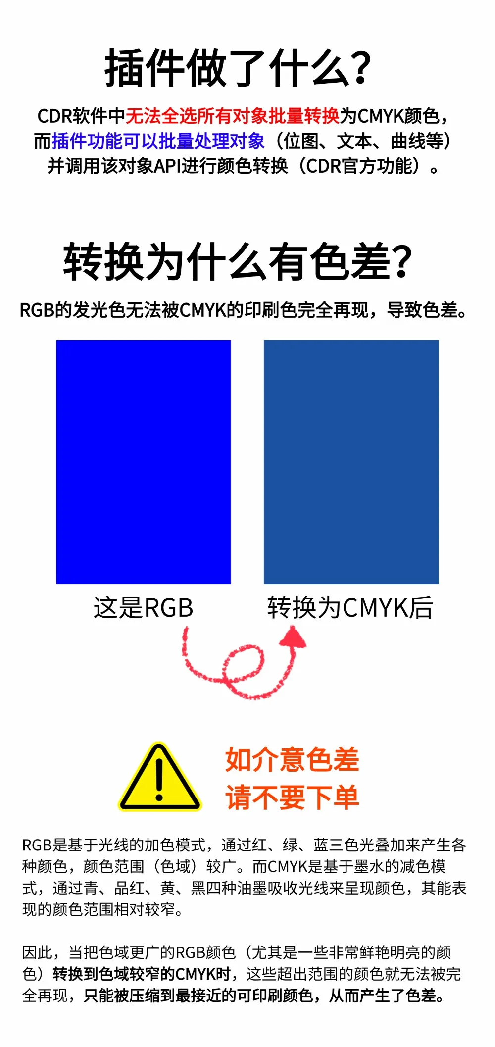 功能简介:该插件可一键将当前选定的图像、形状的填充自动转换为对应的CMYK颜色模式。