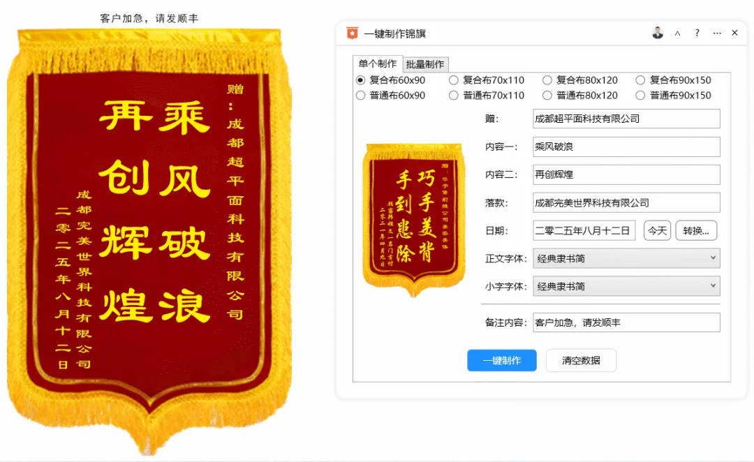 功能简介:一键制作锦旗插件可批量生成复合布及普通布的常见规格锦旗,操作简便快捷。