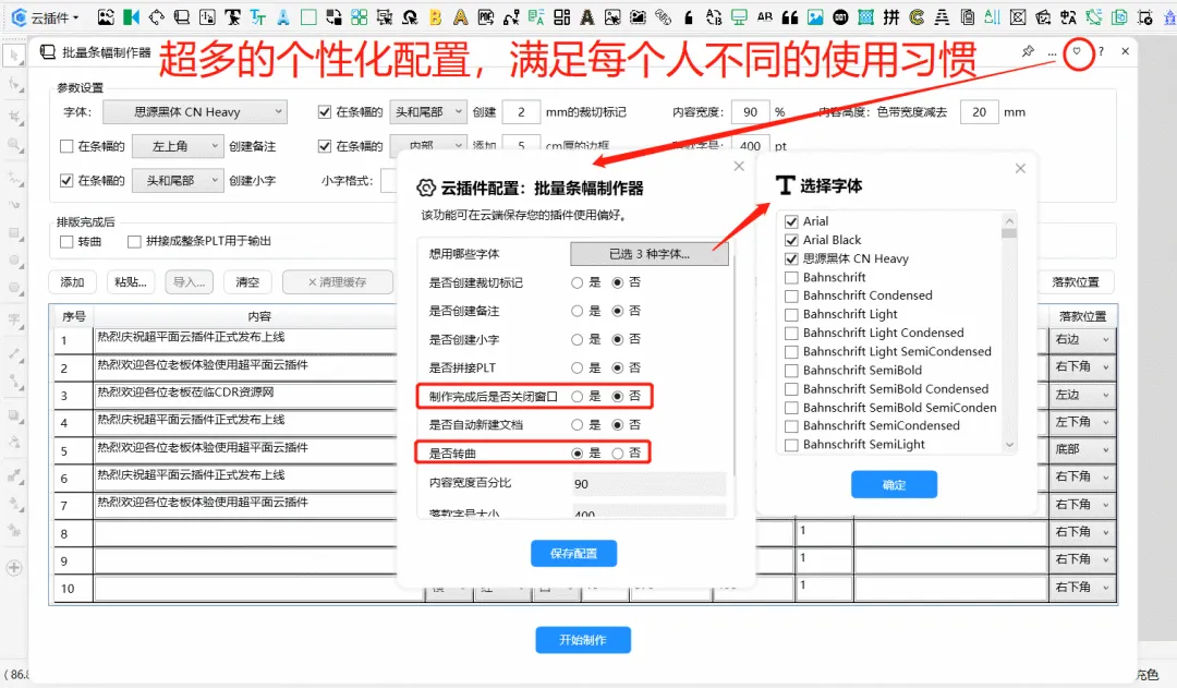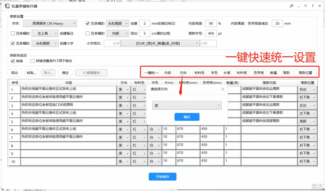 功能简介:批量条幅制作器是一款高效实用的插件,支持批量制作横幅和竖幅,并可一键导出PLT文件。用户可快速配置条幅的内容、方向、布料色、字色、长度、宽度、数量、落款及落款位置等参数,支持右边、右下角、左边、左下角、底部等5种落款位置,并自动适配横幅和竖幅。插件还提供裁切线、小字、备注、外框等功能,裁切线位置和宽度可灵活调整,小字格式支持多种组合。无论是单独制作横幅、竖幅,还是同时制作两者,插件都能自动拼接成可导出的PLT文件,并支持创建带有指定厚度边框的条幅。基于云插件的云配置能力,该插件能够满足个性化需求,适应不同用户的使用习惯。