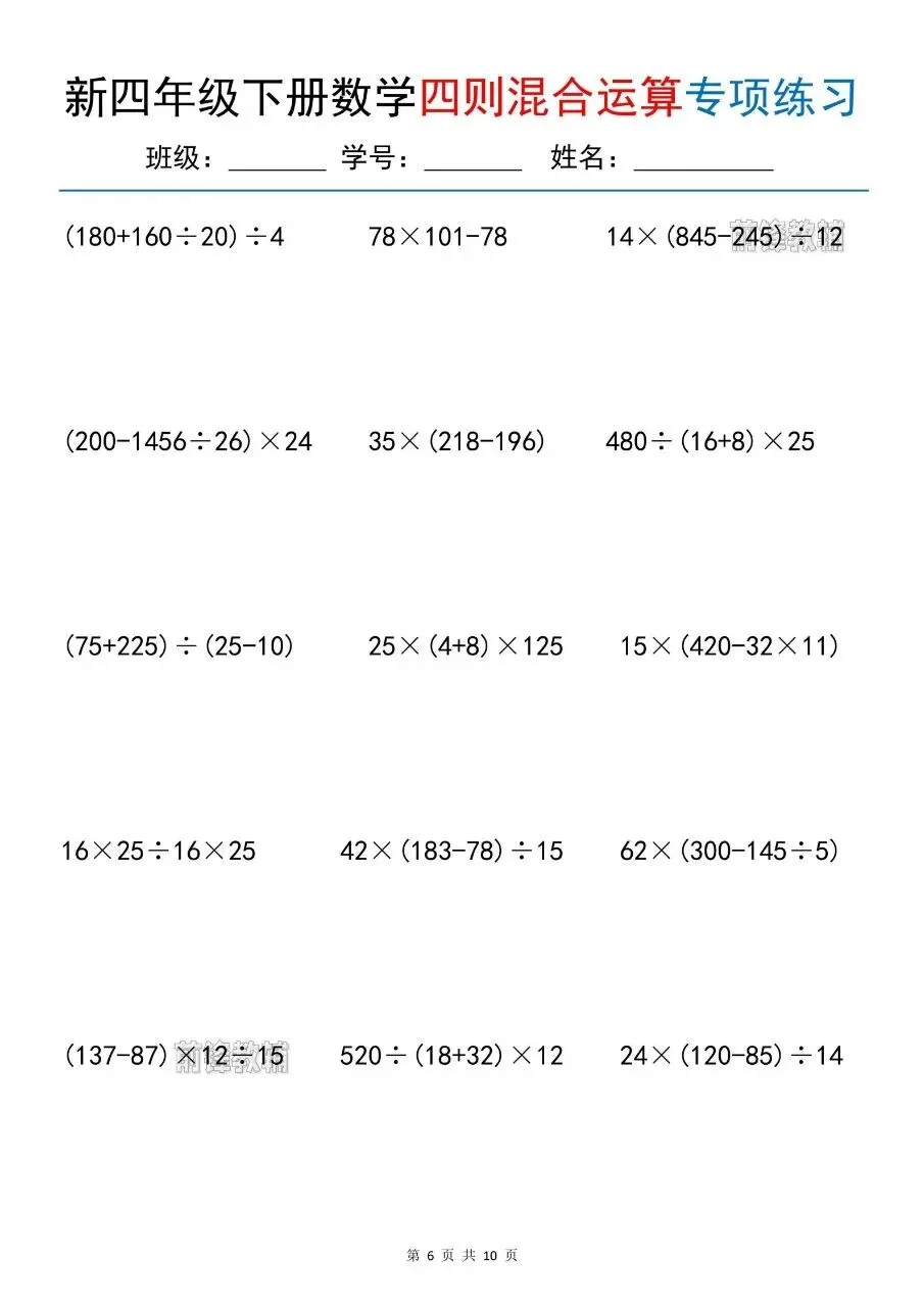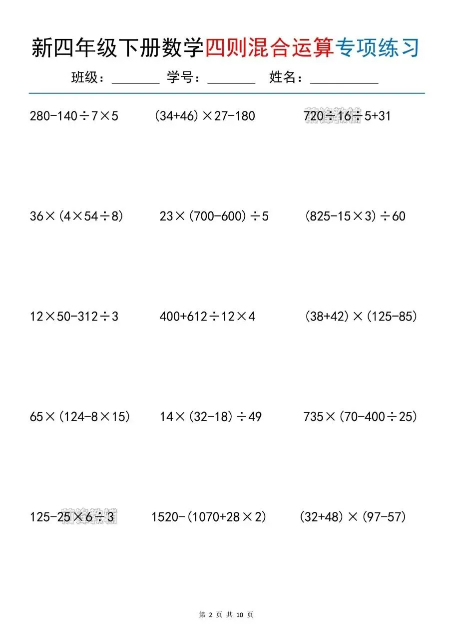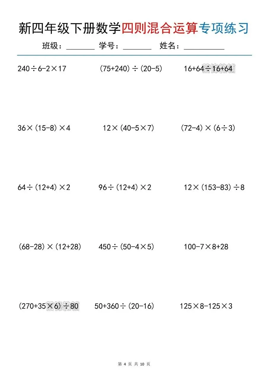 新四年级下册数学四则混合运算专项练习电子版免费领取
