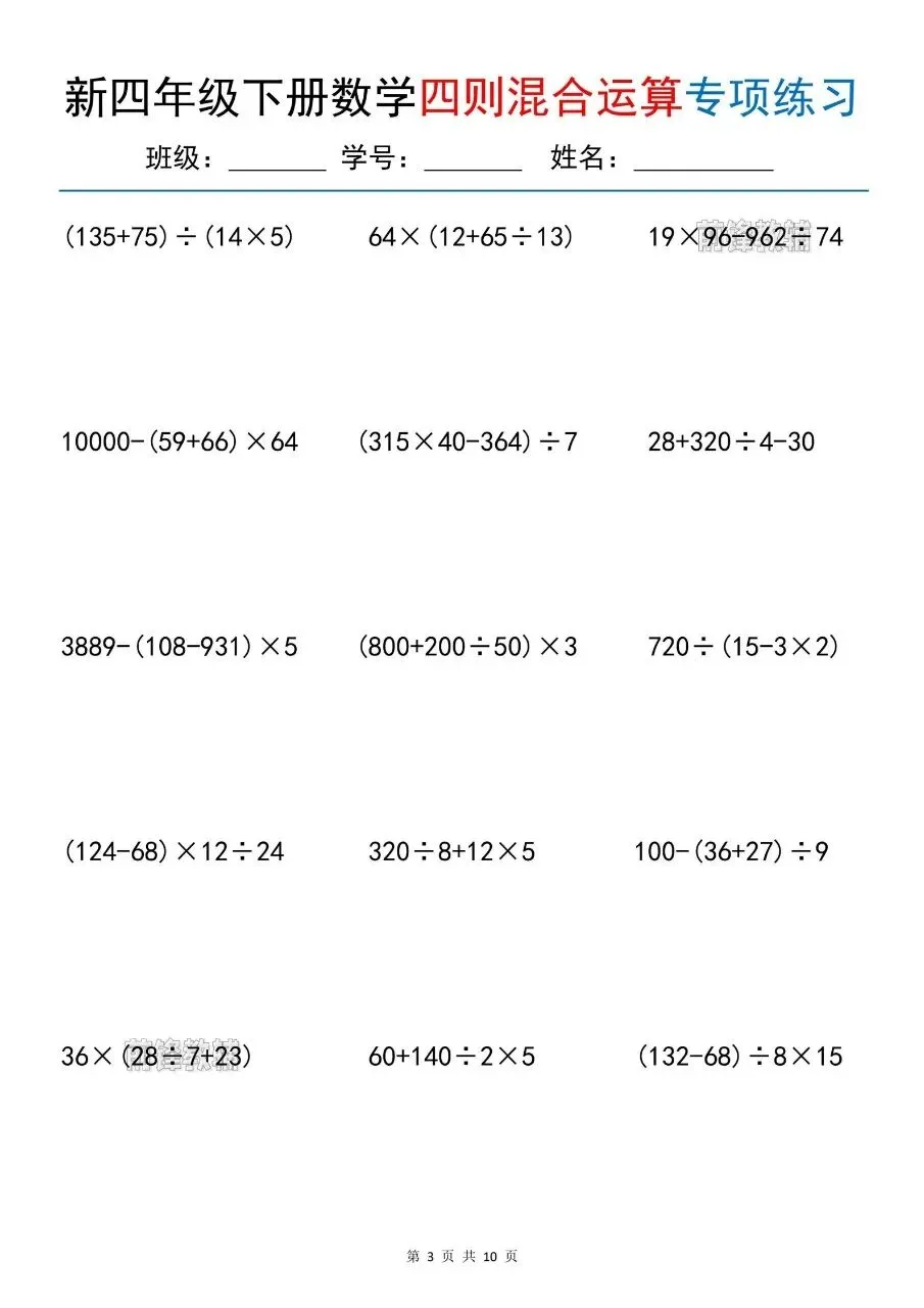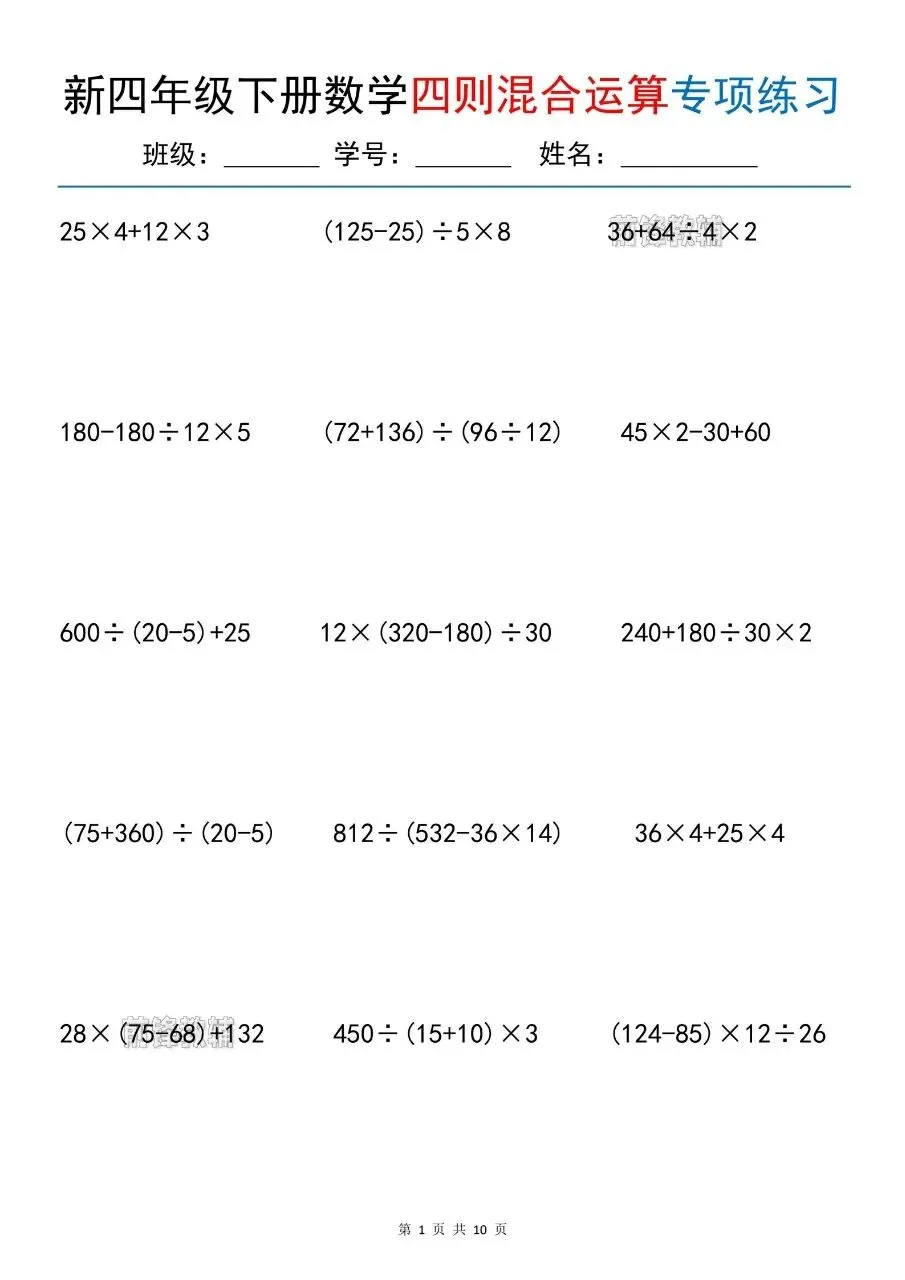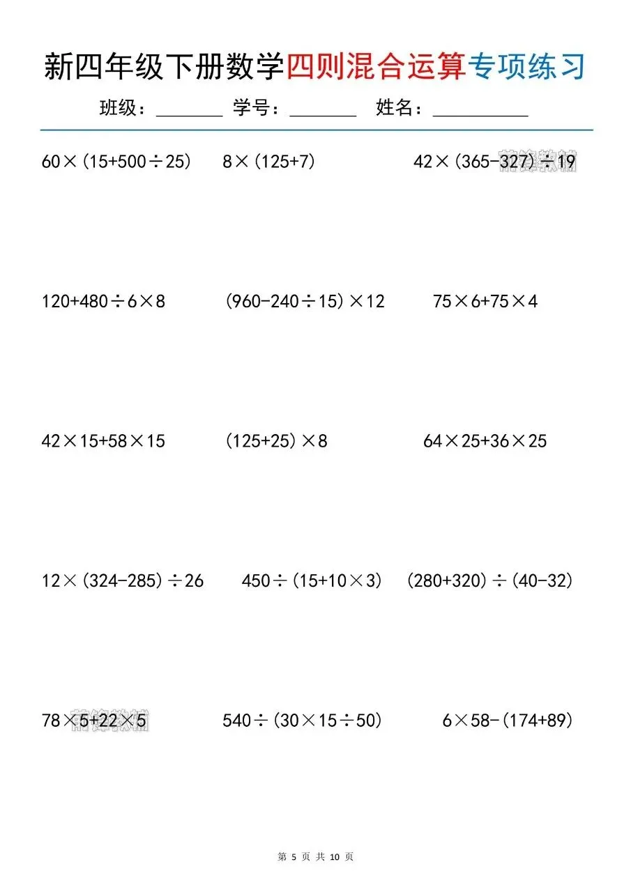 新四年级下册数学四则混合运算专项练习电子版免费领取