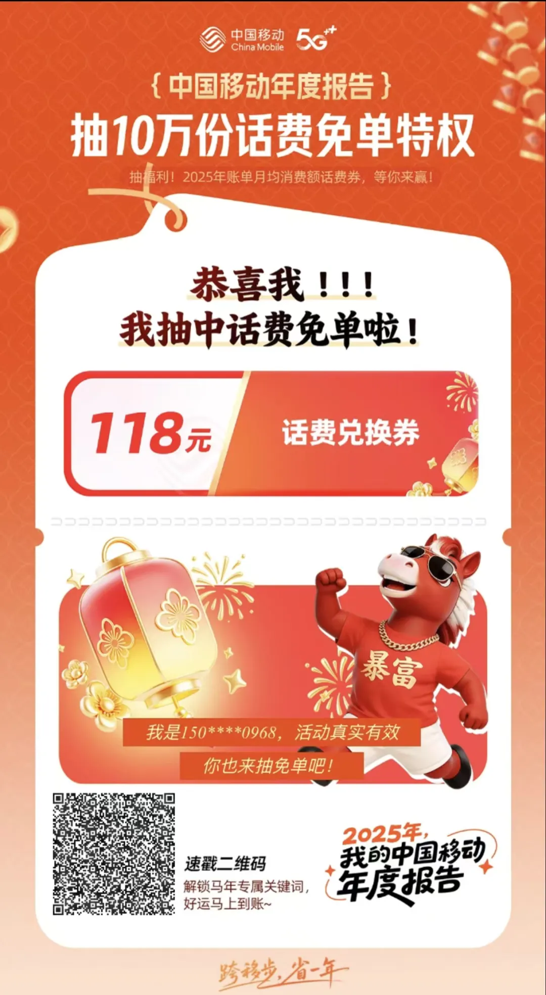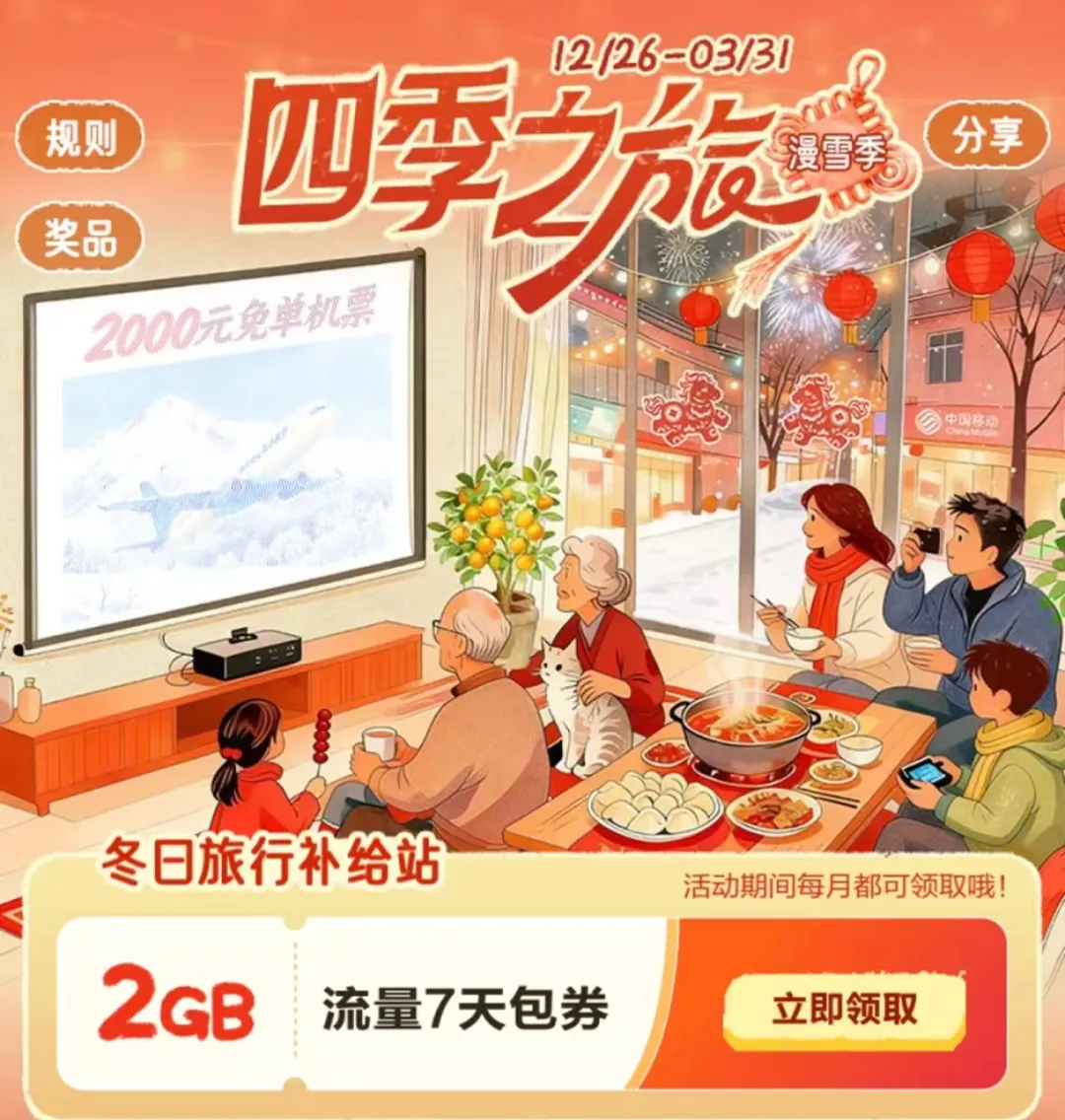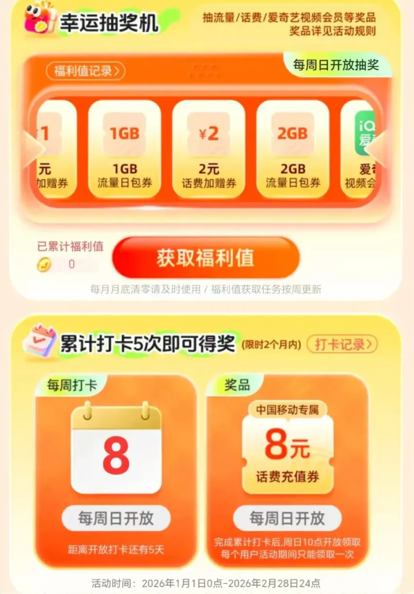 抽奖:可赢5GB 7天包流量券、8元话费、2026元话费加赠券、5000元旅游基金等
