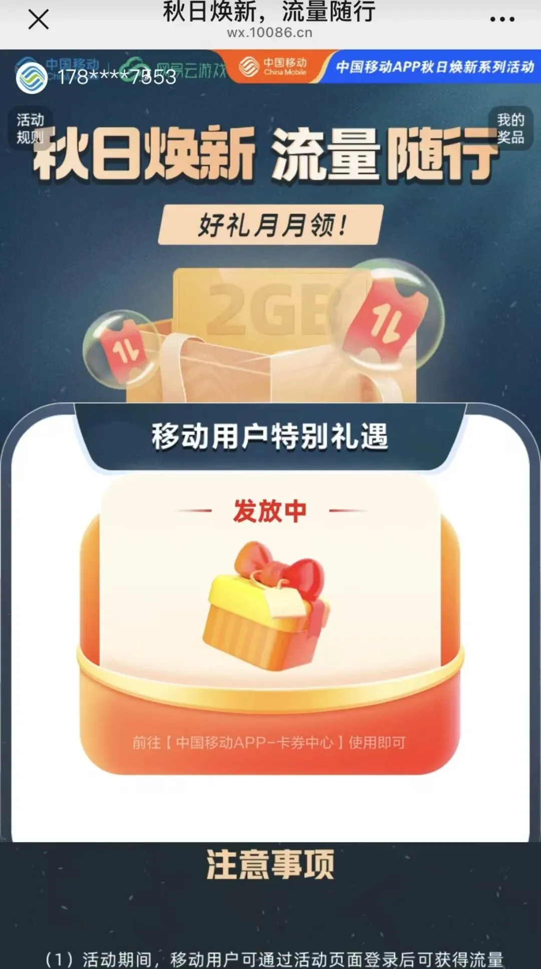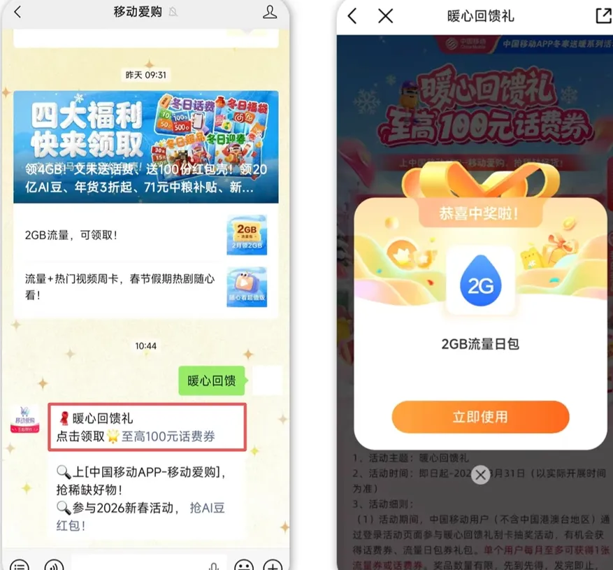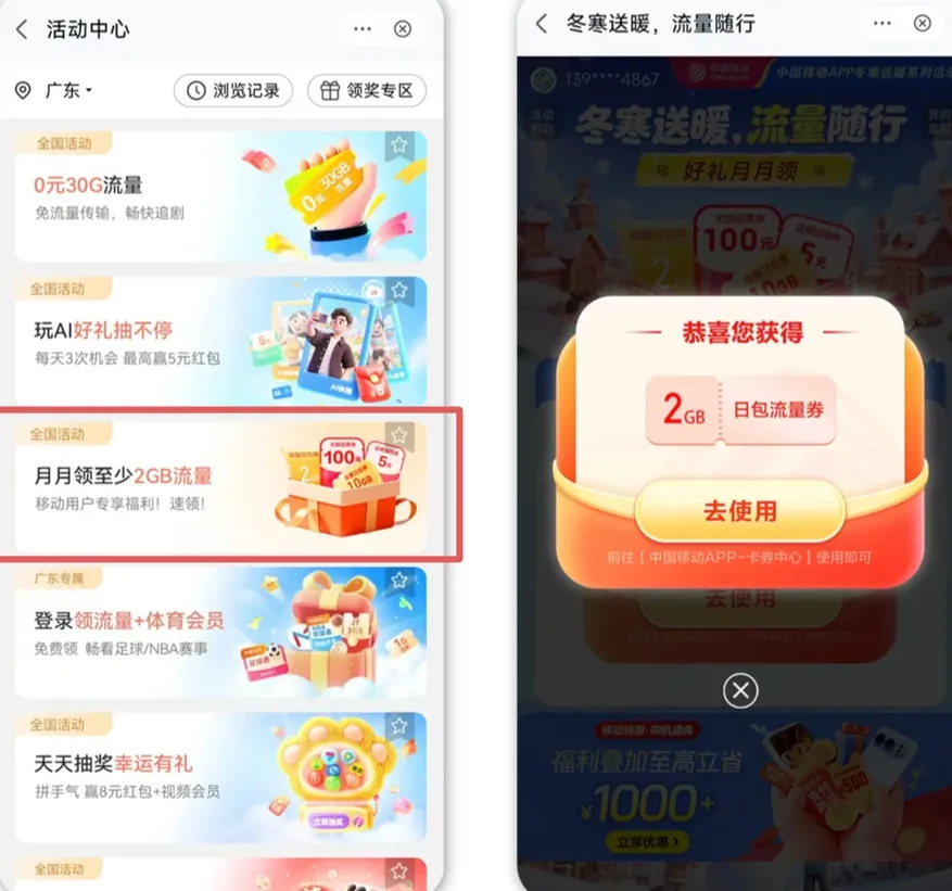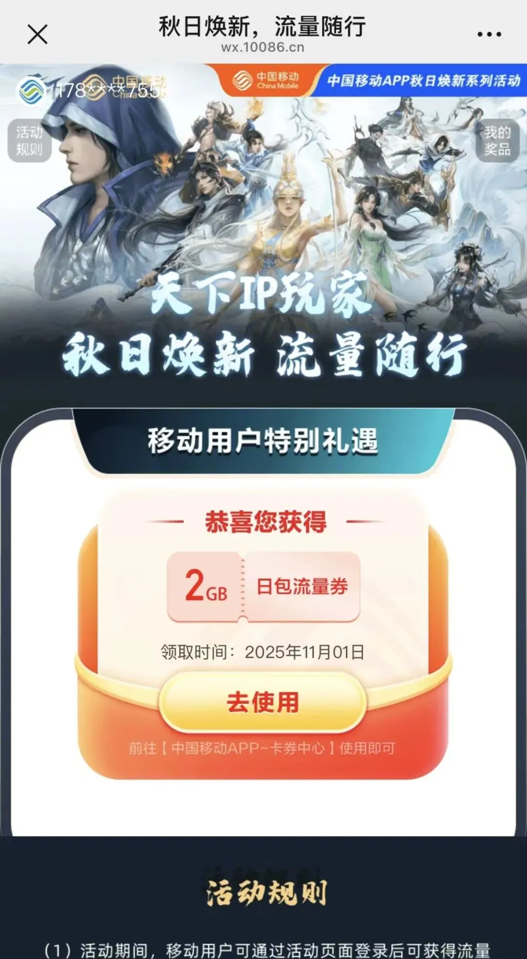 奖品:2GB/10GB流量日包券、5元/100元话费加赠券等。