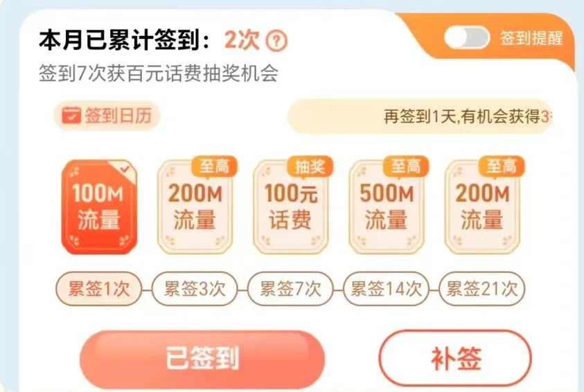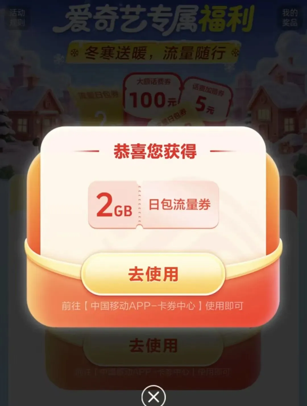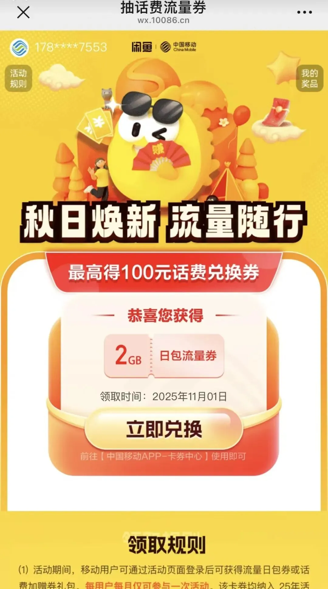奖品:2GB流量日包券、最高100元话费兑换券等。