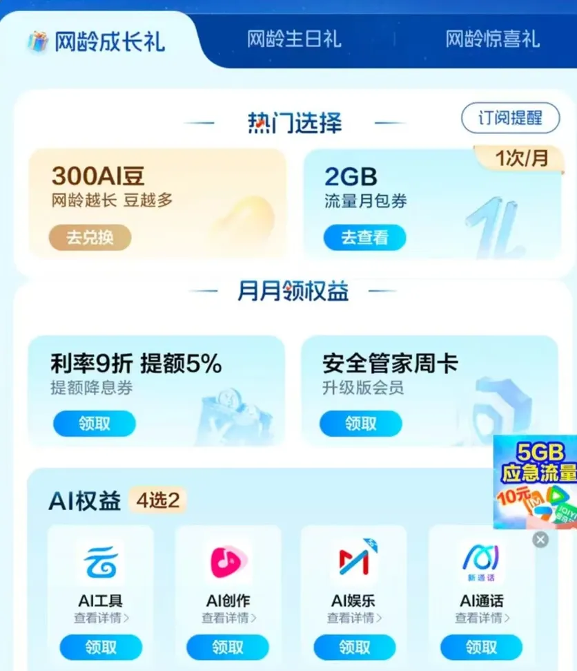 奖品:2GB/10GB流量日包券、5元话费加赠券等。