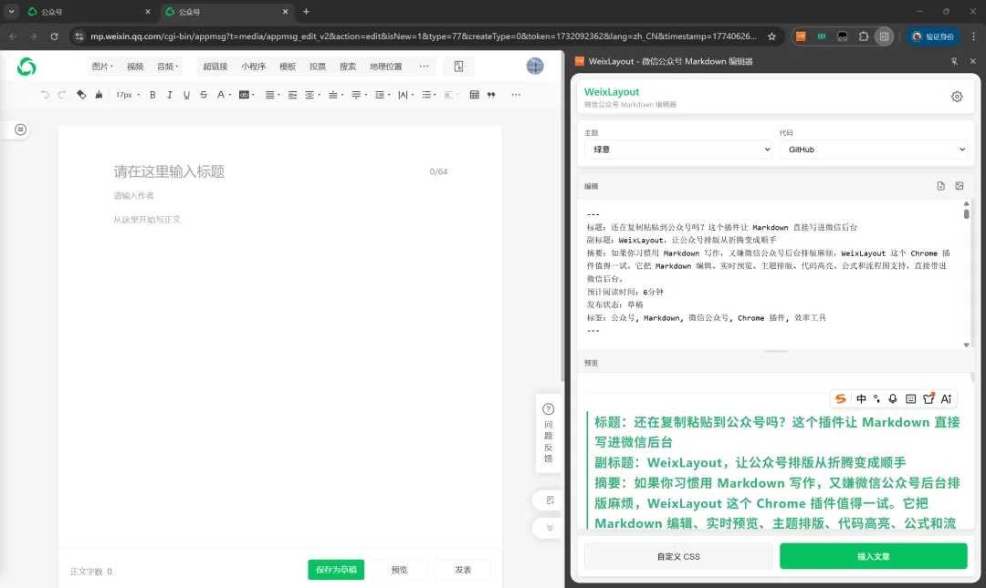 一个让你在微信公众号后台直接使用 Markdown 写作的 Chrome 插件。