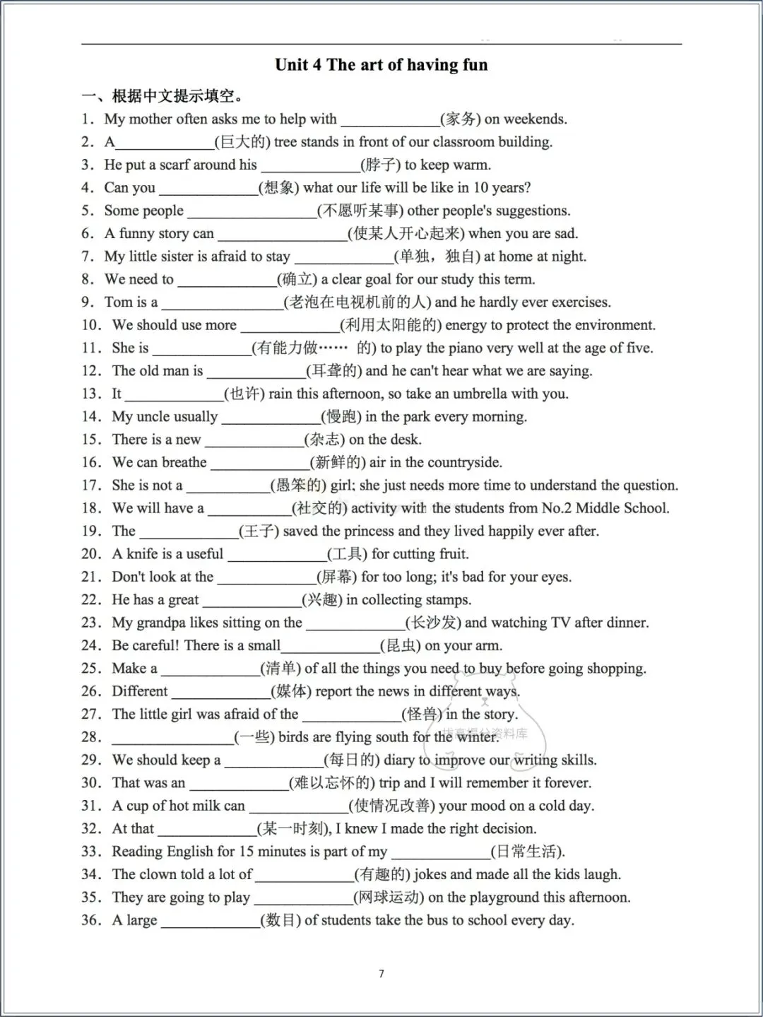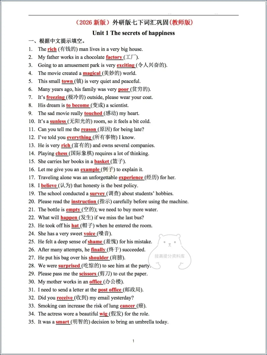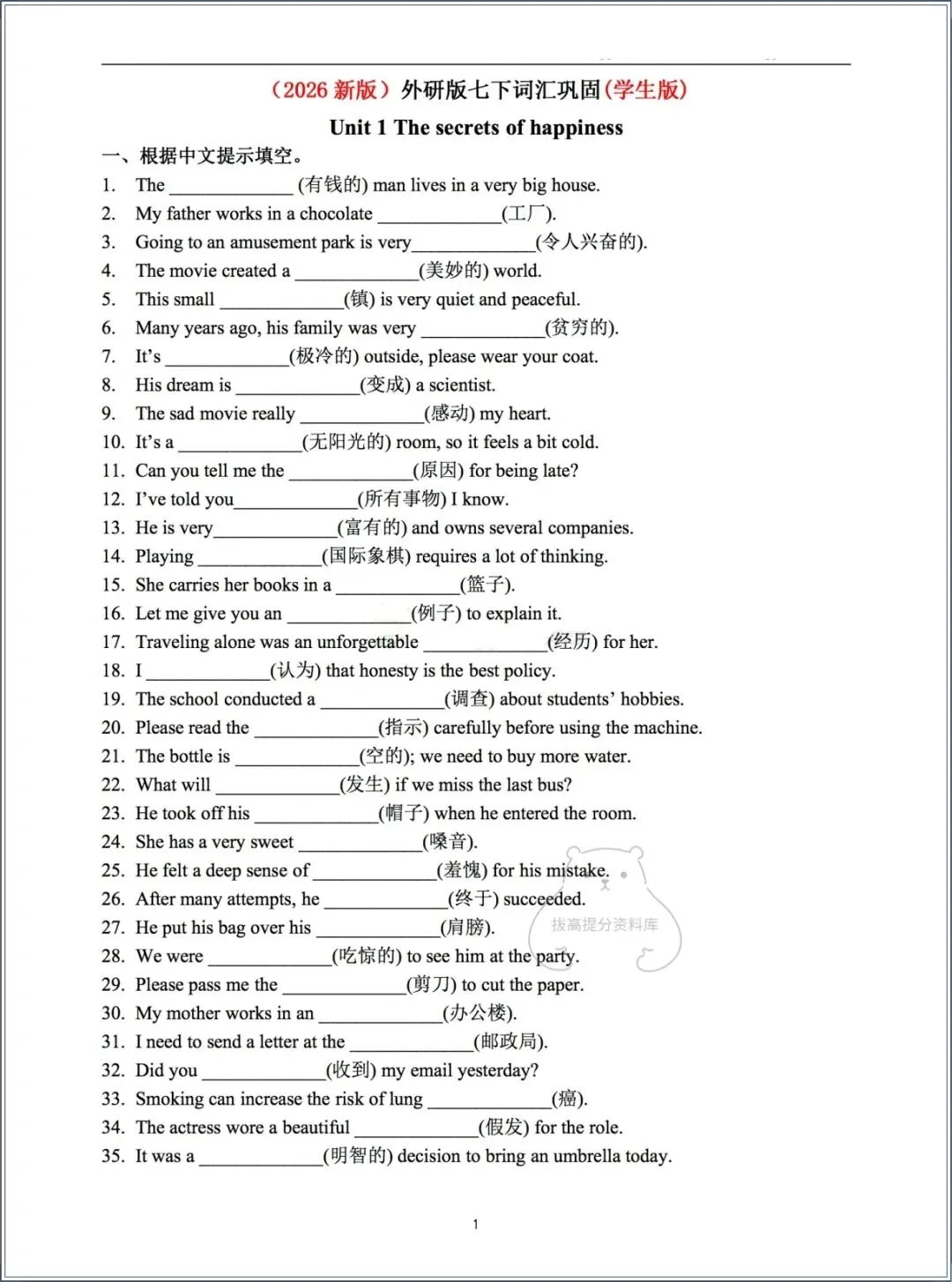 今天分享的资料为:2026春外研版七年级下册(英语)词汇巩固练习+答案,电子版可打印可下载!
