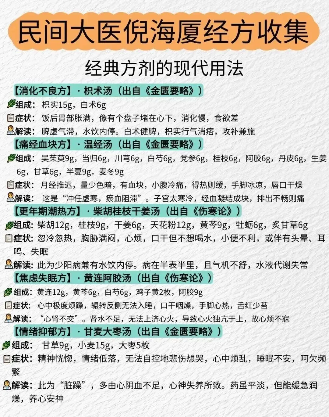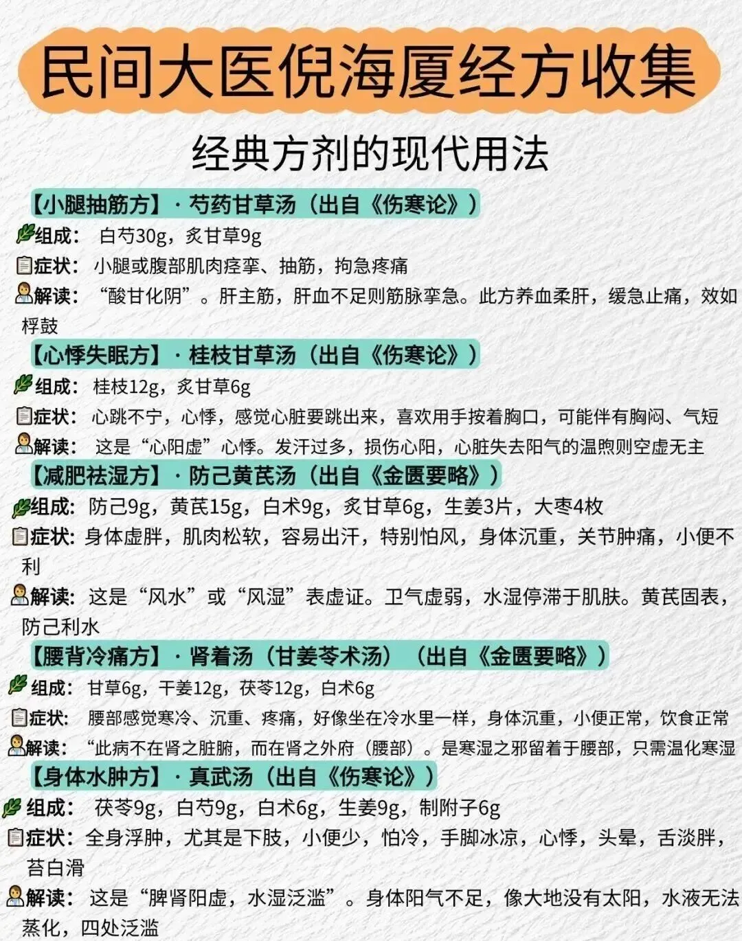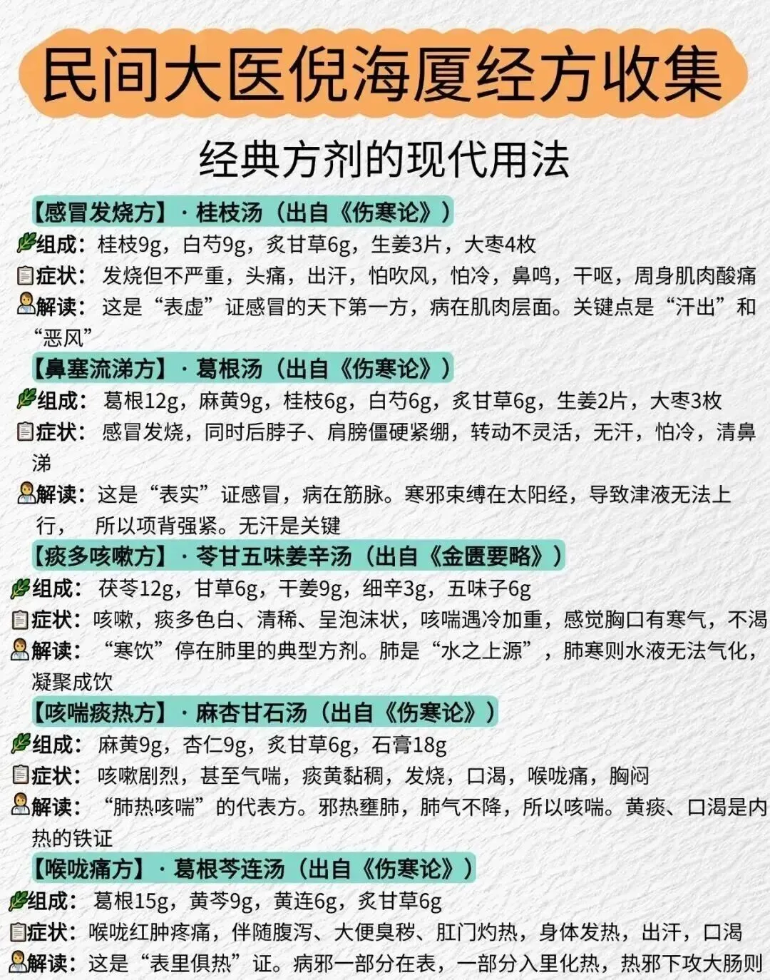 说明:图片中有经方名出处,经方对应症状和证型解读,每张图配的文字是图中经方名和药物组成。
