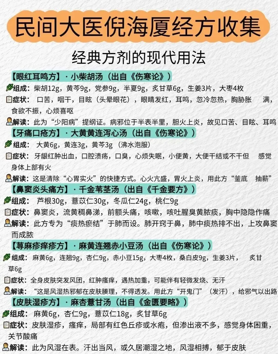 【牙痛口疮方】大黄黄连泻心汤《伤寒论》组成:大黄6g,黄连3g,黄芩3g(沸水泡服)【鼻窦炎头痛方】千金苇茎汤《千金要方》组成:芦根30g,薏苡仁30g,冬瓜仁24g,桃仁9g 【荨麻疹痒疹方】麻黄连翘赤小豆汤《伤寒论》