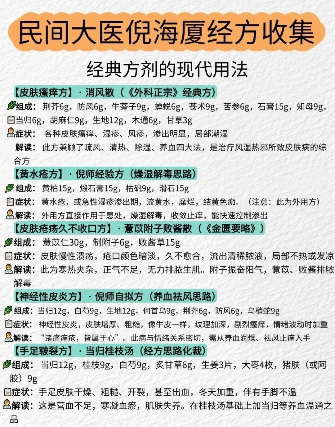 【皮肤瘙痒方】消风散《外科正宗》经典方组成:荆芥6g,防风6g,牛蒡子9g,蝉蜕6g,苍术9g,苦参6g,石膏15g,知母9g,当归6g,胡麻仁9g,生地12g,木通6g,甘草3g 【黄水疮方】倪师经验方(燥湿解毒思路)