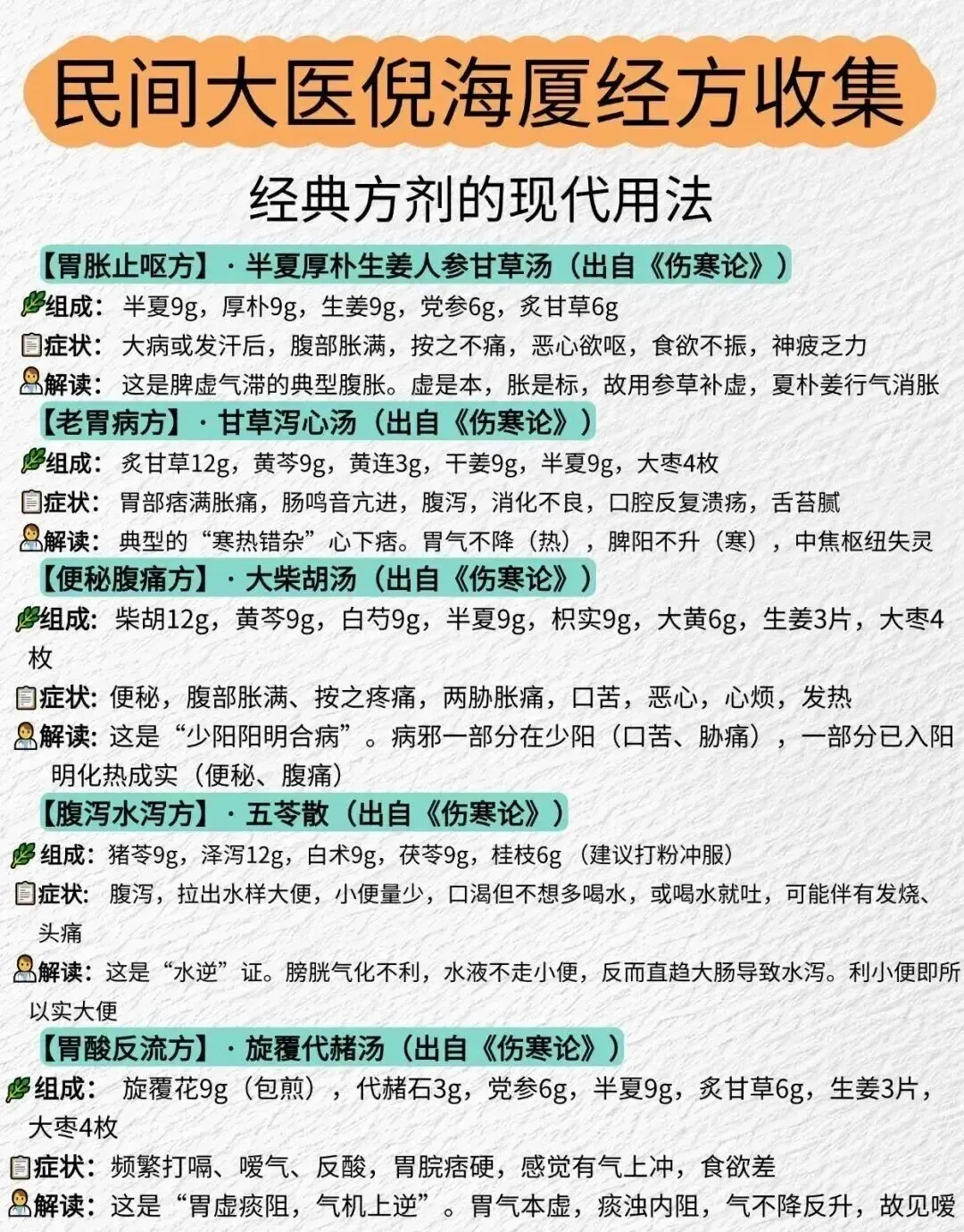 【便秘腹痛方】大柴胡汤《伤寒论》组成:柴胡12g,黄芩9g,白芍9g,半夏9g,枳实9g,大黄6g,生姜3片,大枣4 枚【腹泻水泻方】五苓散《伤寒论》组成:猪苓9g,泽泻12g,白术9g,茯苓9g,桂枝6g(建议打粉冲服)【胃酸反流方】旋覆代赭汤《伤寒论》组成:旋覆花9g(包煎),代赭石3g,党参6g,半夏9g,炙甘草6g,生姜3片,大枣4枚