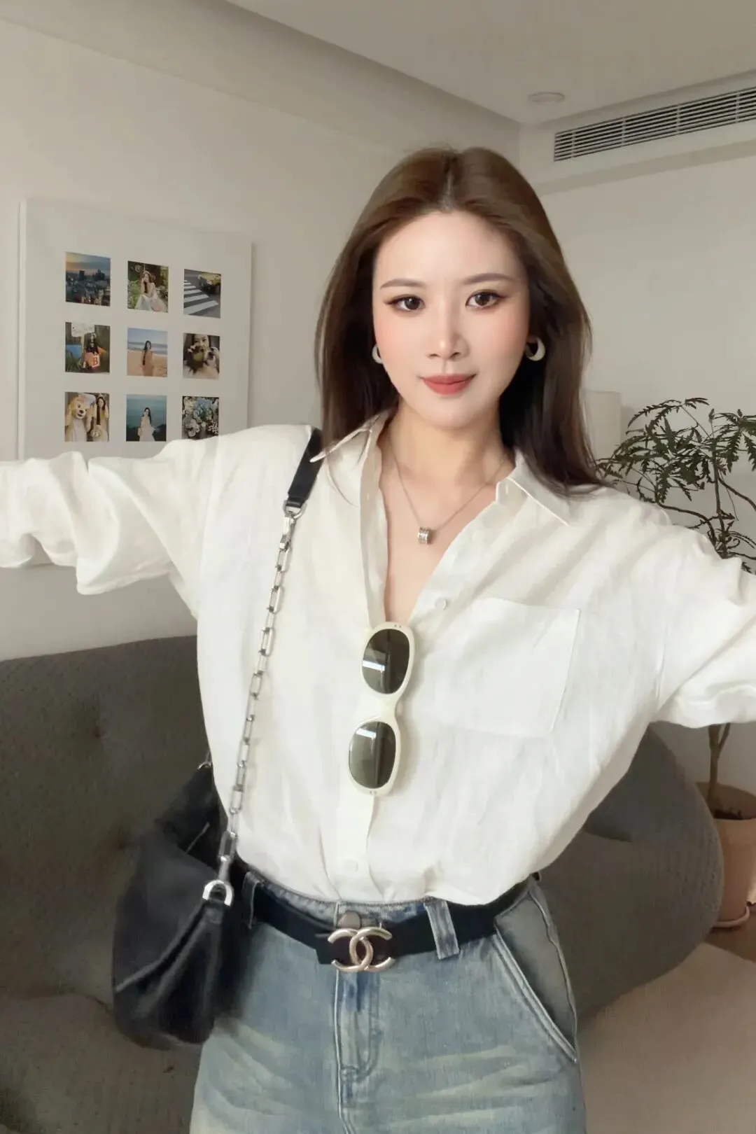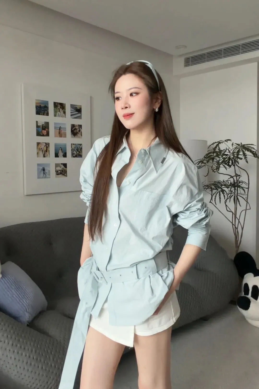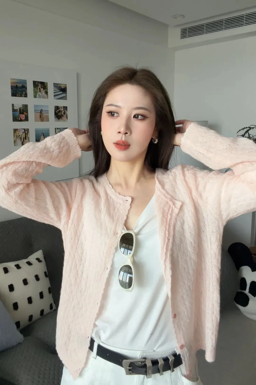 这件是比较偏长一点的,我个人喜欢把它塞进去穿,这样会更加利落一点。领口可以多打开一点点,这样子整个呼吸感会更强一些。