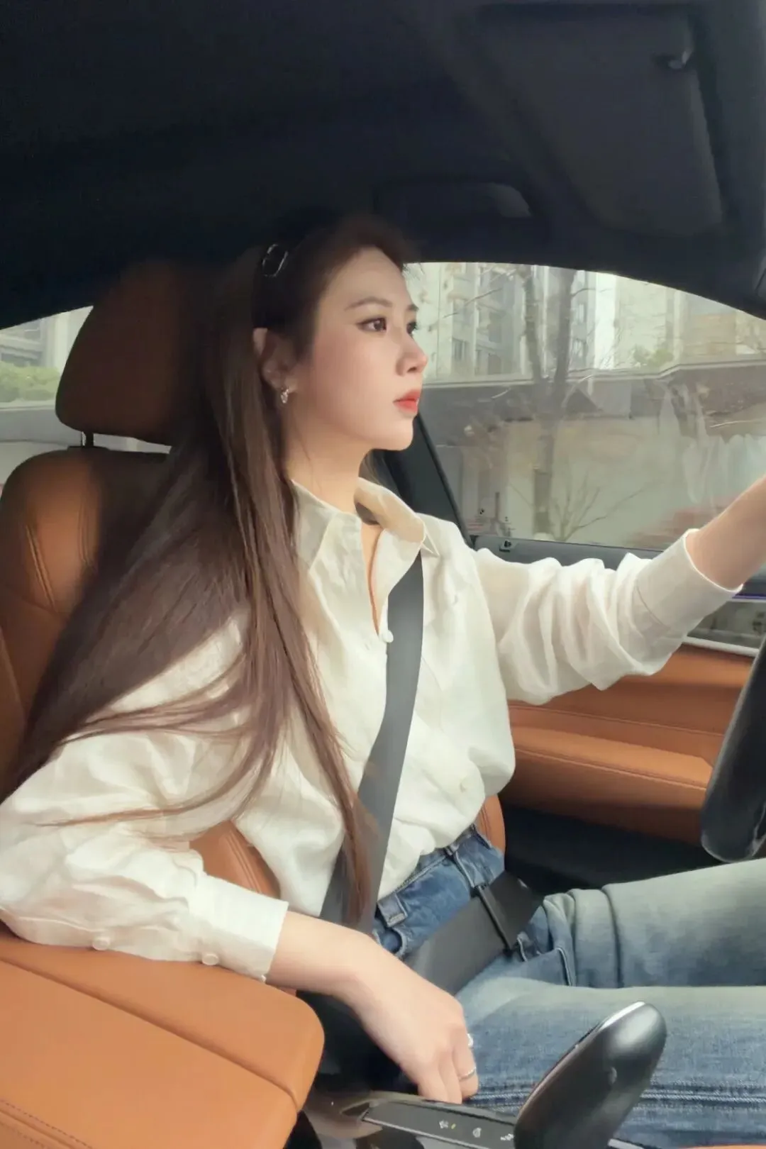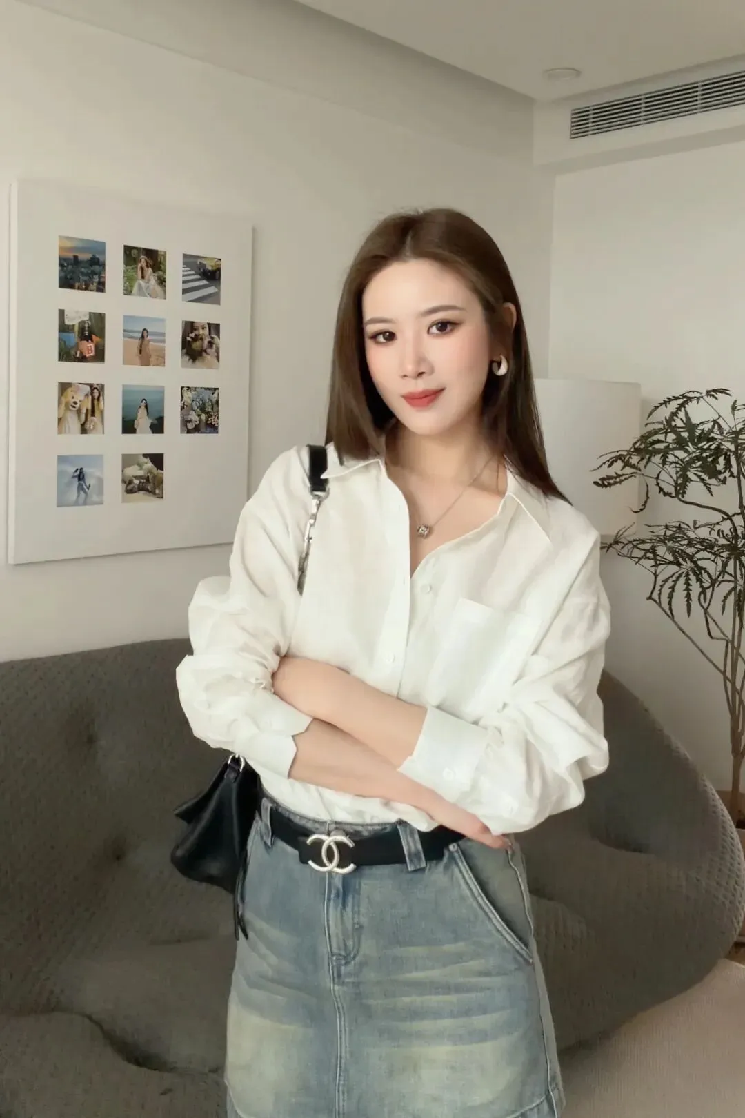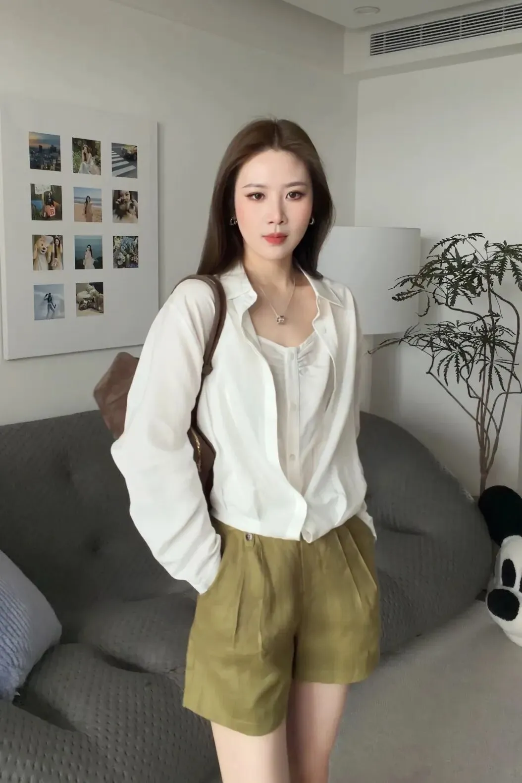 这件是比较偏长一点的,我个人喜欢把它塞进去穿,这样会更加利落一点。领口可以多打开一点点,这样子整个呼吸感会更强一些。