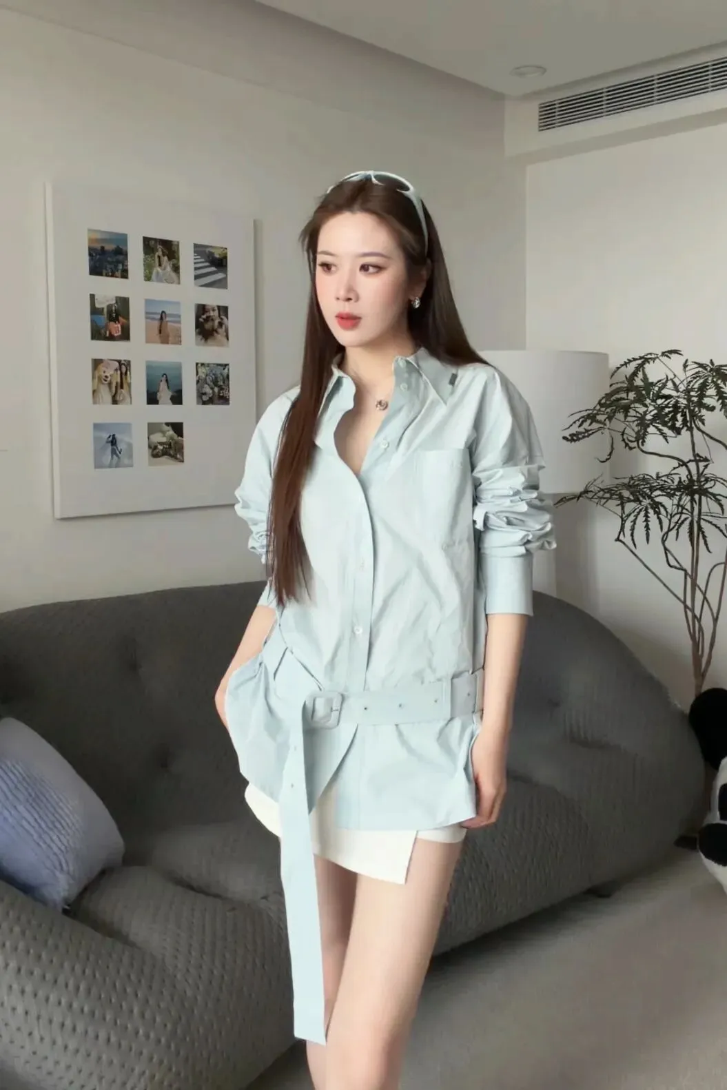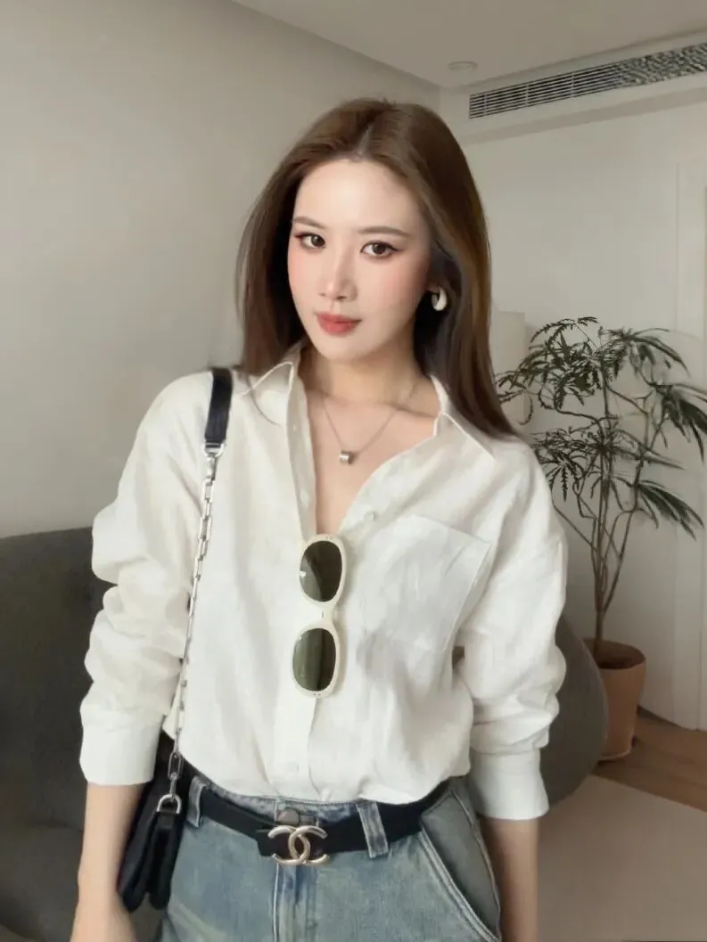 这件是我们这一次很特别版型的衬衫,它是偏长一点的,可以把搭白色的短半裙,或者白色短裤,会显得比例非常好。